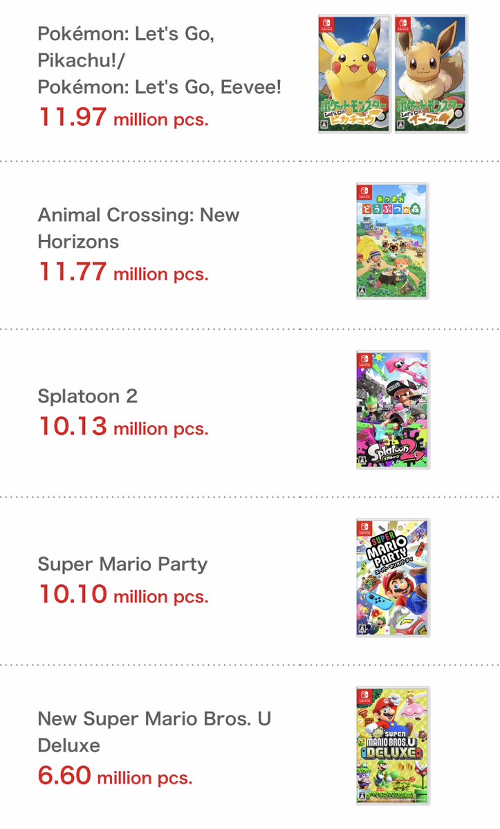 - Pour finir ce top 10 des ventes de la Nintendo Switch, on retrouve New Super Mario Bros U Deluxe, seul titre en deçà des dix millions de ventes avec 6,6 millions d’exemplaires ayant trouvé preneur.