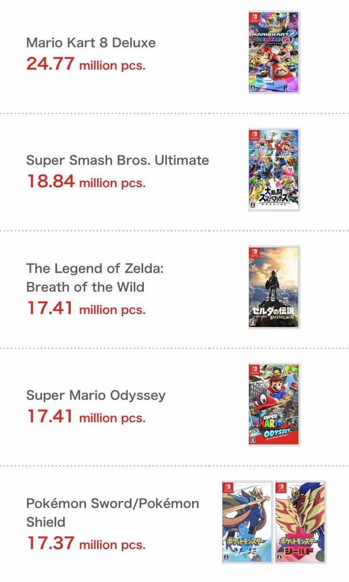 - Le jeu le plus vendu de la Nintendo Switch reste encore Mario Kart 8 Deluxe : ce n’est pas vraiment une surprise, ce dernier est continuellement présent dans les tops de ventes de jeux, que ce soit en France ou au Japon. Avec 1,81 millions d’exemplaires vendus en plus lors du dernier trimestre, le dernier jeu de course de Nintendo culmine aujourd’hui à 24,77 millions de ventes. Ces chiffres lui permettent de devenir le deuxième Mario Kart le plus vendu, devant l’épisode DS et derrière l’épisode Wii.