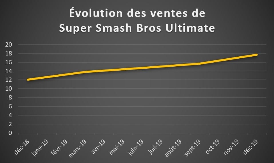 - Nous retrouvons en seconde position du top des ventes Super Smash Bros Ultimate qui, avec presque deux millions de jeux vendus durant les fêtes de Noël, comptabilise désormais 17 680 000 exemplaires vendus à travers le monde. Super Smash Bros Ultimate est de ce fait le jeu le plus vendu de sa série.