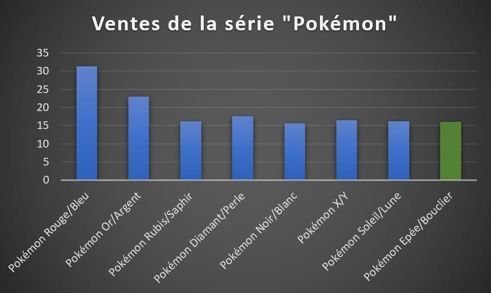- Pokémon Épée et Bouclier réalise une véritable performance en se vendant à hauteur de 16 060 000 exemplaires en seulement un mois et demi de commercialisation. Les ventes de cet opus constituent ni plus ni moins le meilleur démarrage pour un jeu Pokémon et cette performance permet au soft de se placer cinquième meilleure vente de la Nintendo Switch. Pour ce qui est de la série principale, Pokémon Épée et Bouclier s’avère être déjà plus vendu que Pokémon Noir et Blanc et talonne Pokémon Soleil et Lune.