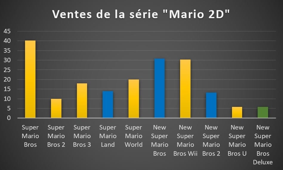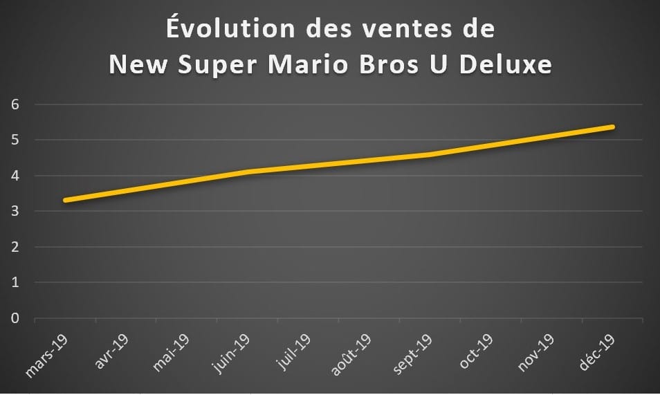 - On retrouve à nouveau un titre Wii U dans le top des ventes de jeux Nintendo Switch, à savoir New Super Mario Bros U Deluxe. Les 1 260 000 ventes du dernier trimestre portent le jeu à total de presque 6 millions. Il dépasse par ailleurs sa version originale sur Wii U.