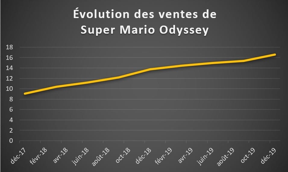 - Super Mario Odyssey se place en troisième position, avec un peu plus d’un millions de jeux ont vendus pendant les fêtes de fin d’année. Le titre culmine donc à 16.59 millions de ventes au total et confirme son statut de Mario 3D numéro 1 des ventes.