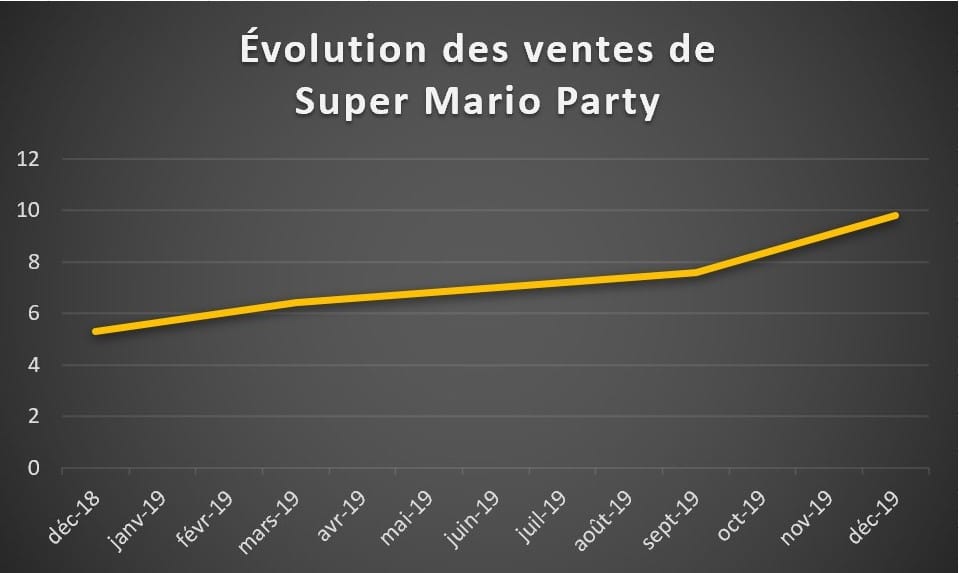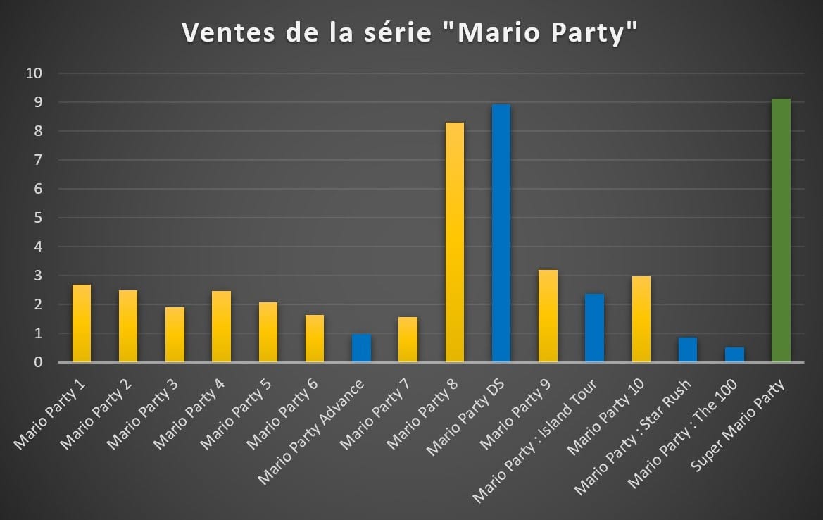 - Le retour en grâce des ventes d’une des plus vielles séries de Nintendo se fait avec Super Mario Party. Ce dernier profite de son caractère familial pour distribuer 1 530 000 exemplaires supplémentaires durant les fêtes de fin d’année. Super Mario Party dispose maintenant de 9 120 000 exemplaires, rattrapant son retard sur Mario Party DS, jeu le plus vendu de la série.