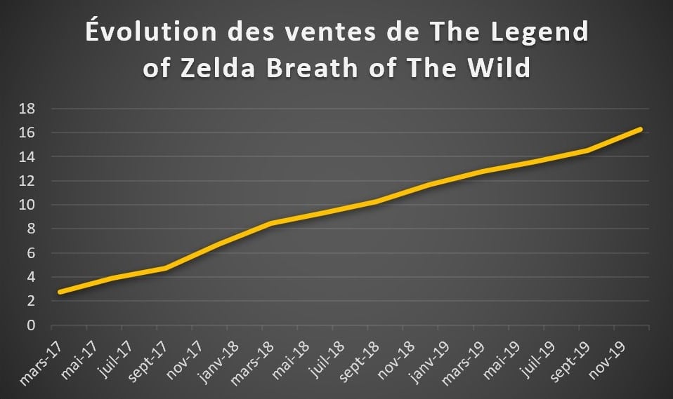 - The Legend of Zelda: Breath of the Wild continue de bien se vendre à l’aube de son troisième anniversaire. Les fêtes de fin d’année on permis au titre de Nintendo de se vendre à presque 2 millions d’exemplaires pour un total de 16.34 millions ; il s’agit encore une fois du jeu le plus vendu de sa franchise.