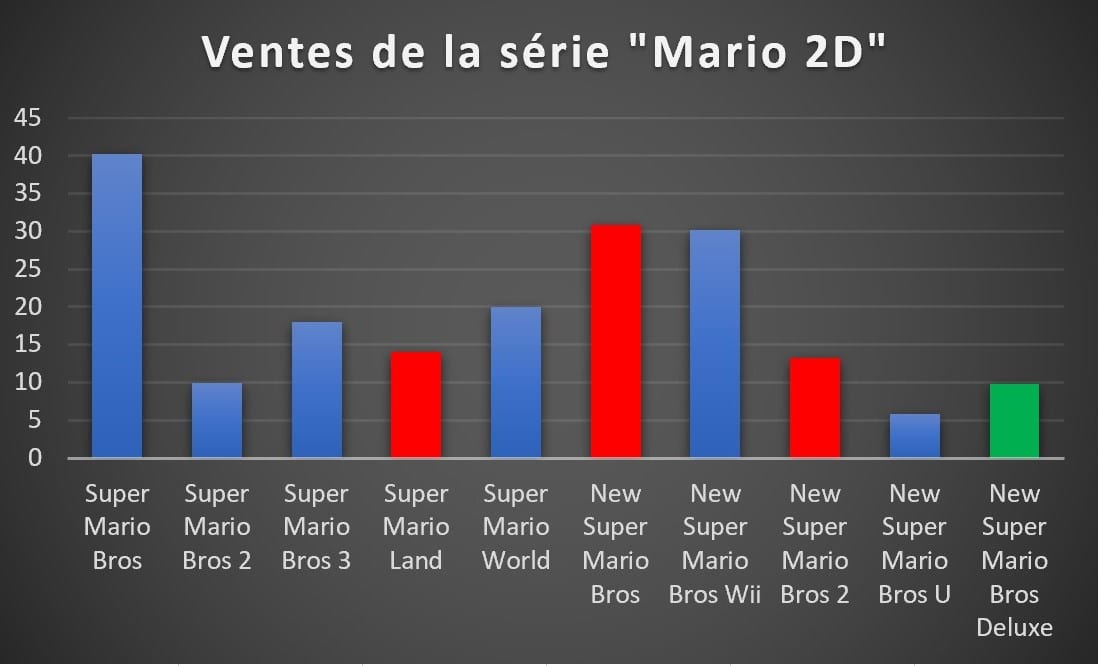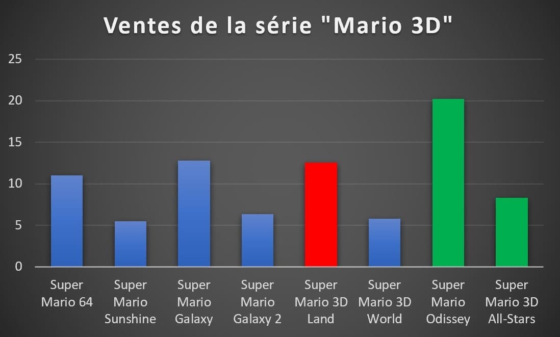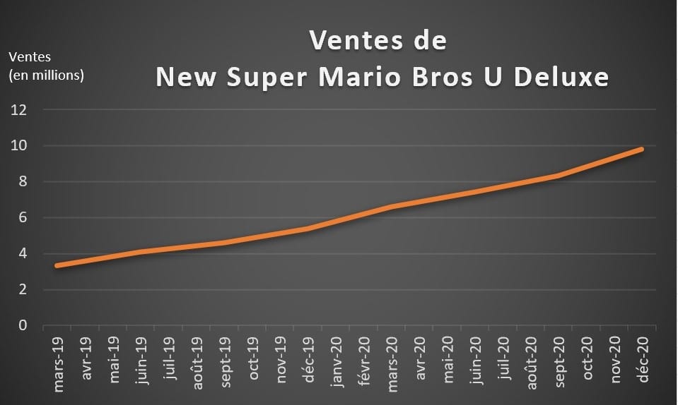 - Quatre jeux sont à la porte des 10 millions d’exemplaires vendus : New Super Mario Bros U Deluxe, Luigi’s Mansion 3, Ring Fit Adventure et Super Mario 3D All Stars. S’il est fort probable que les trois premiers parviendront à dépasser ce cap, il sera intéressant de voir pour le cas Super Mario 3D All Stars dont la commercialisation s’arrête à la fin du mois de mars ;