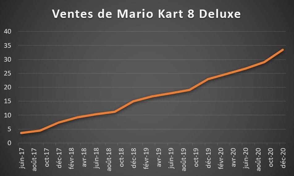 Le top 10 des ventes de jeux de la plateforme n’a pas bougé depuis le dernier bilan trimestriel. Mario Kart 8 Deluxe continue de régner sur ce classement avec 33.41 millions d’exemplaires vendus. Il est tout proche de rattraper Mario Kart Wii et de devenir ainsi l’épisode le plus écoulé de la série. Animal Crossing: New Horizons passe lui aussi les 30 millions de ventes, réalisant un record de 31.18 millions jeux vendus pour une exclusivité lors d’une année fiscale. Trois nouveaux jeux sont parvenus à dépasser les 20 millions de ventes : The Legend of Zelda: Breath of the Wild, Pokémon Epée / Bouclier et Super Mario Odyssey.