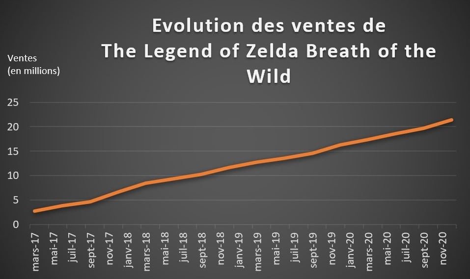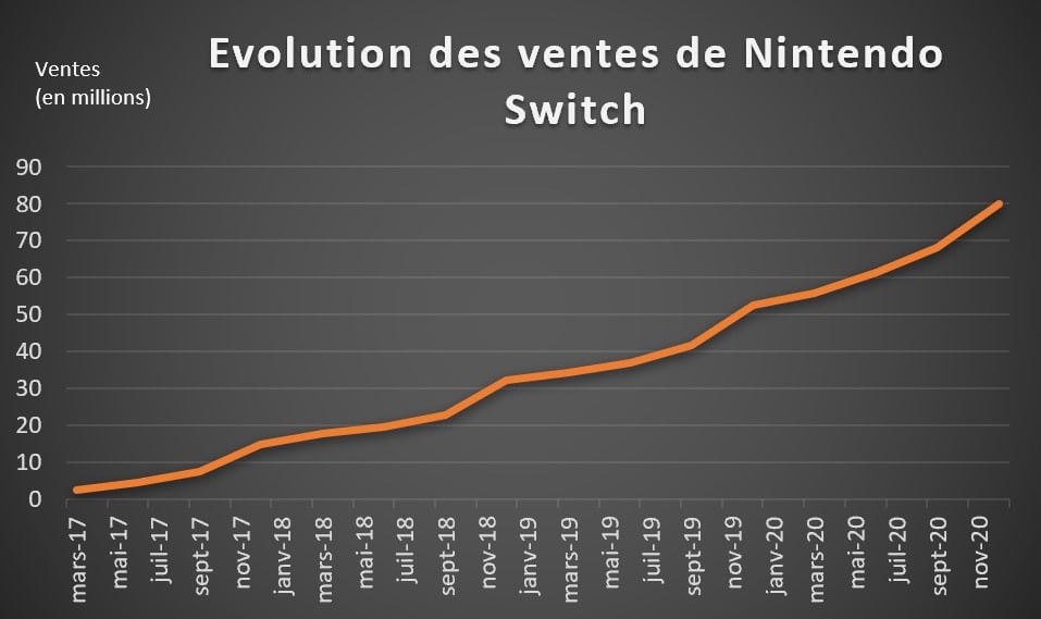 Avant de parler du nombre de machines et de jeux écoulés dans le monde, regardons rapidement les bénéfices engrangés par Nintendo lors du dernier exercice fiscal. Sur les neuf premiers mois de l’année (du 1er avril 2020 au 31 décembre 2020), Nintendo a réalisé un chiffre d’affaires de 11 milliards d’euros pour un bénéfice opérationnel au-delà de 4.1 milliards d’euros. Quant au bénéfice net, le meilleur de la firme japonaise à ce jour s’élève à 2.2 milliards d’euros en 2008, l’entreprise vise un record de 3.15 milliards à la fin cette année fiscale, le 31 mars 2021 (source : Oscar Lemaire).