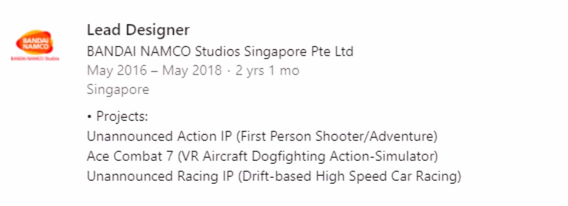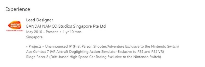 Cela rejoindrait parfaitement ce qui avait été trouvé en février 2018 sur la page Linkedin de Shawn Pitman, ancien lead designer dans le même studio, sur laquelle il était marqué qu’il travaillait sur un jeu de tir à la première personne exclusif à la Switch (probablement Metroid Prime 4, dont le développement était assuré par Bandai Namco avant que Nintendo, non satisfait du résultat, ne le fasse recommencer par Retro Studios) et sur Ridge Racer 8, présenté comme exclusif à la console hybride. Aujourd’hui, son profil a été modifié et la mention de Ridge Racer a été remplacée par « licence de course non-annoncée (jeu de course à grande vitesse basé sur le drift)« .