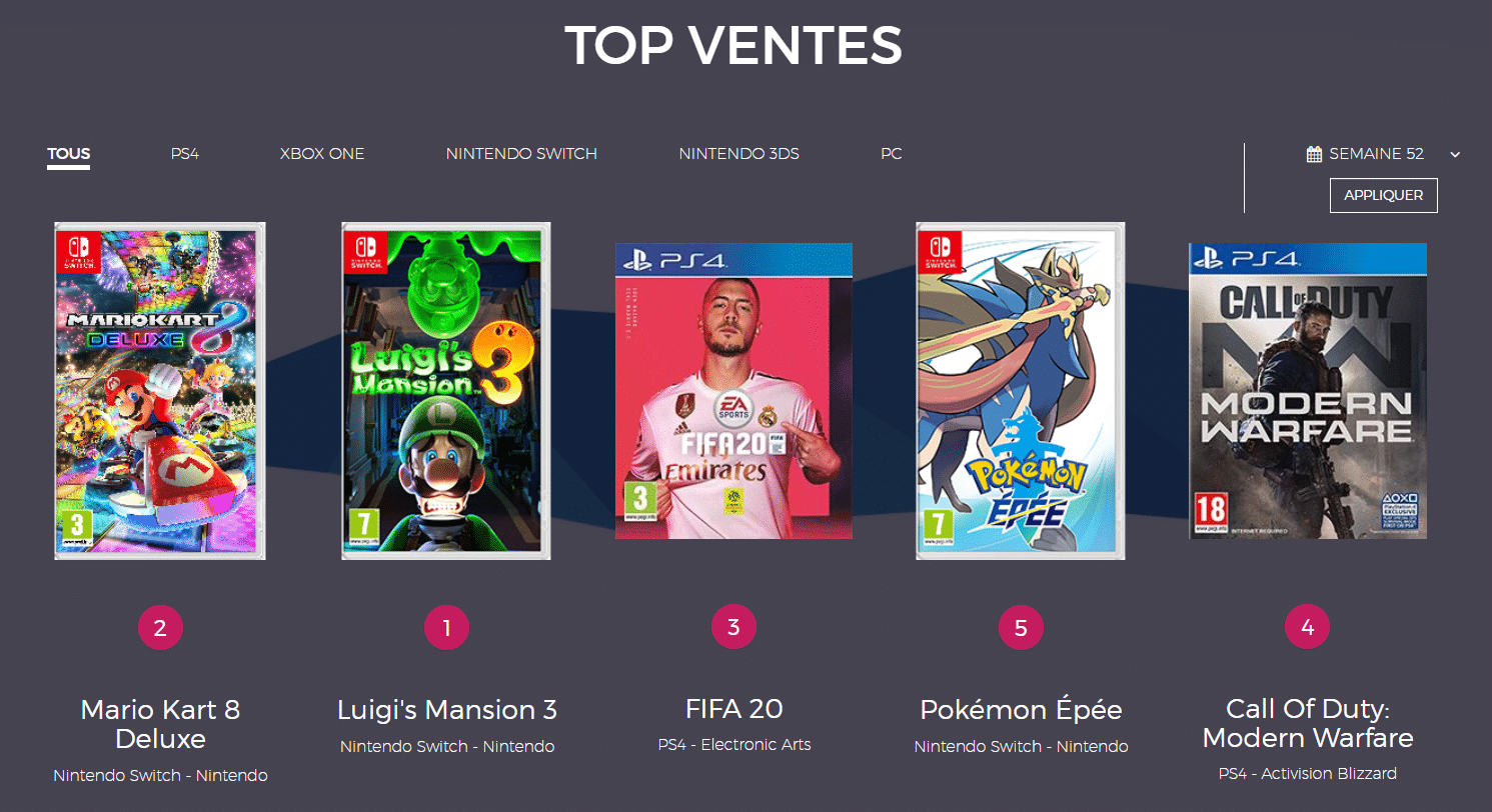 Le classement reprend les mêmes jeux que la semaine dernière, mais à des places différentes. Ainsi, Mario Kart 8 Deluxe reprend la tête du top des ventes au détriment de Luigi’s Mansion 3 qui passe en 2ème position. FIFA 20 sur PS4 se maintient, tandis que Pokémon Epée monte d’un cran et déloge la version PS4 de Call of Duty : Modern Warfare qui se trouve en dernière position du top 5. Du Mario Kart, du FIFA, du Call of Duty et du Pokémon : un classement tout à fait logique pour une fin d’année !