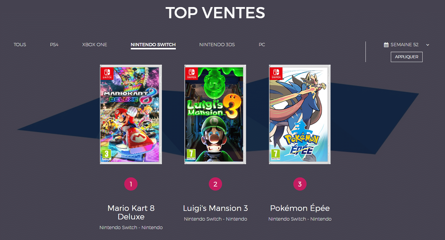 Pas de surprise pour le top 3 des ventes de jeux en France sur Nintendo Switch : on retrouve les mêmes titres que dans le top général. Malheureusement, à part ces 3 best-sellers qui resurgissent toutes les semaines ou presque dans le classement, nous ne savons rien des de la performance des autres jeux de la console hybride en France. Si le succès de Mario Kart 8 Deluxe ou Pokémon Epée n’est pas une surprise, le succès de Luigi’s Mansion 3 est plus surprenant bien que totalement justifié : le titre est d’une qualité remarquable et nous vous invitons à lire l’excellent test du cher LatoJuana, disponible ici, si vous voulez vous faire une meilleure idée de la chose. À la semaine prochaine pour un nouveau compte-rendu des ventes de la semaine en France !
