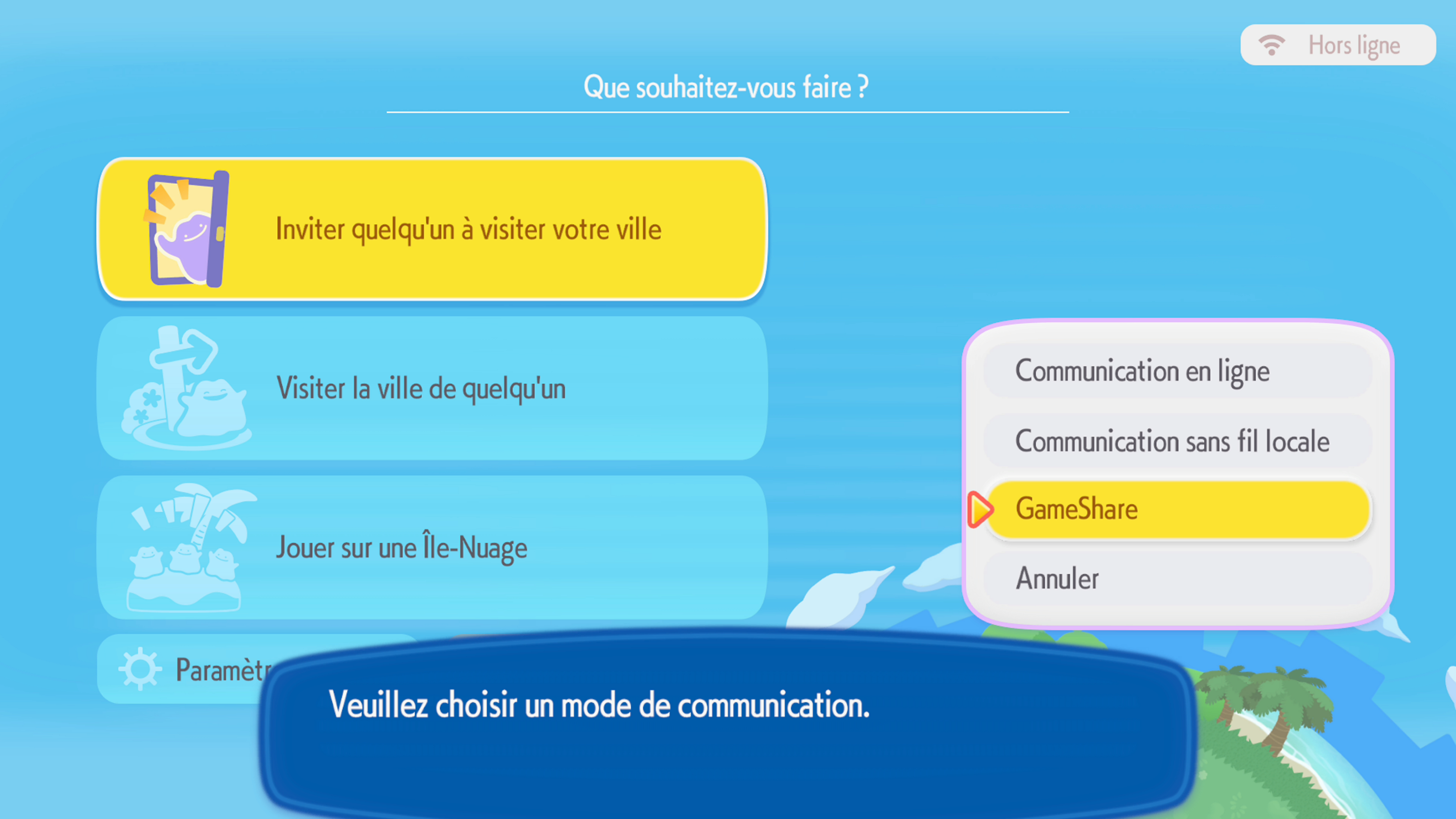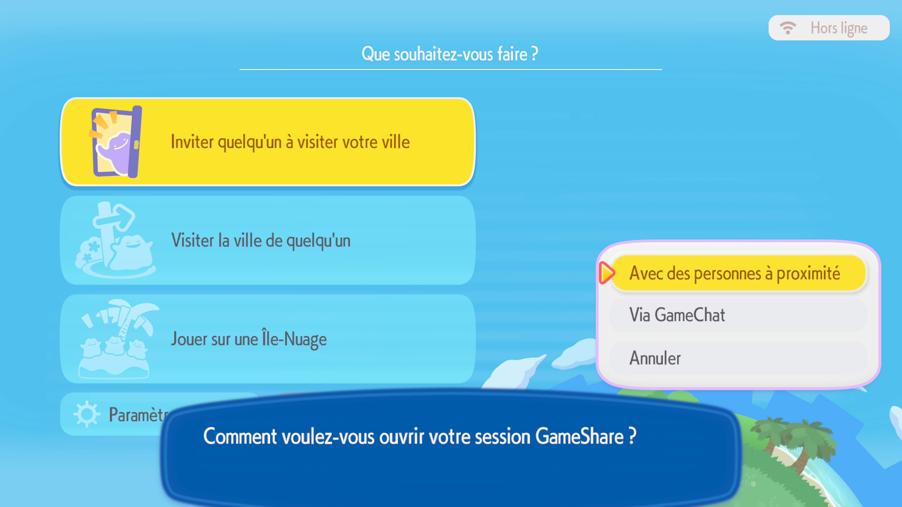 Sur l’île, interagissez avec le PC du Centre Pokémon. Dès qu’il vous laisse le faire (après avoir nommé l’île), rendez-vous dans « Jouer en réseau », sélectionnez « Inviter quelqu’un à visiter votre ville » puis « GameShare ». A ce moment, vous pourrez choisir si vous préférez utiliser la communication locale ou GameChat.