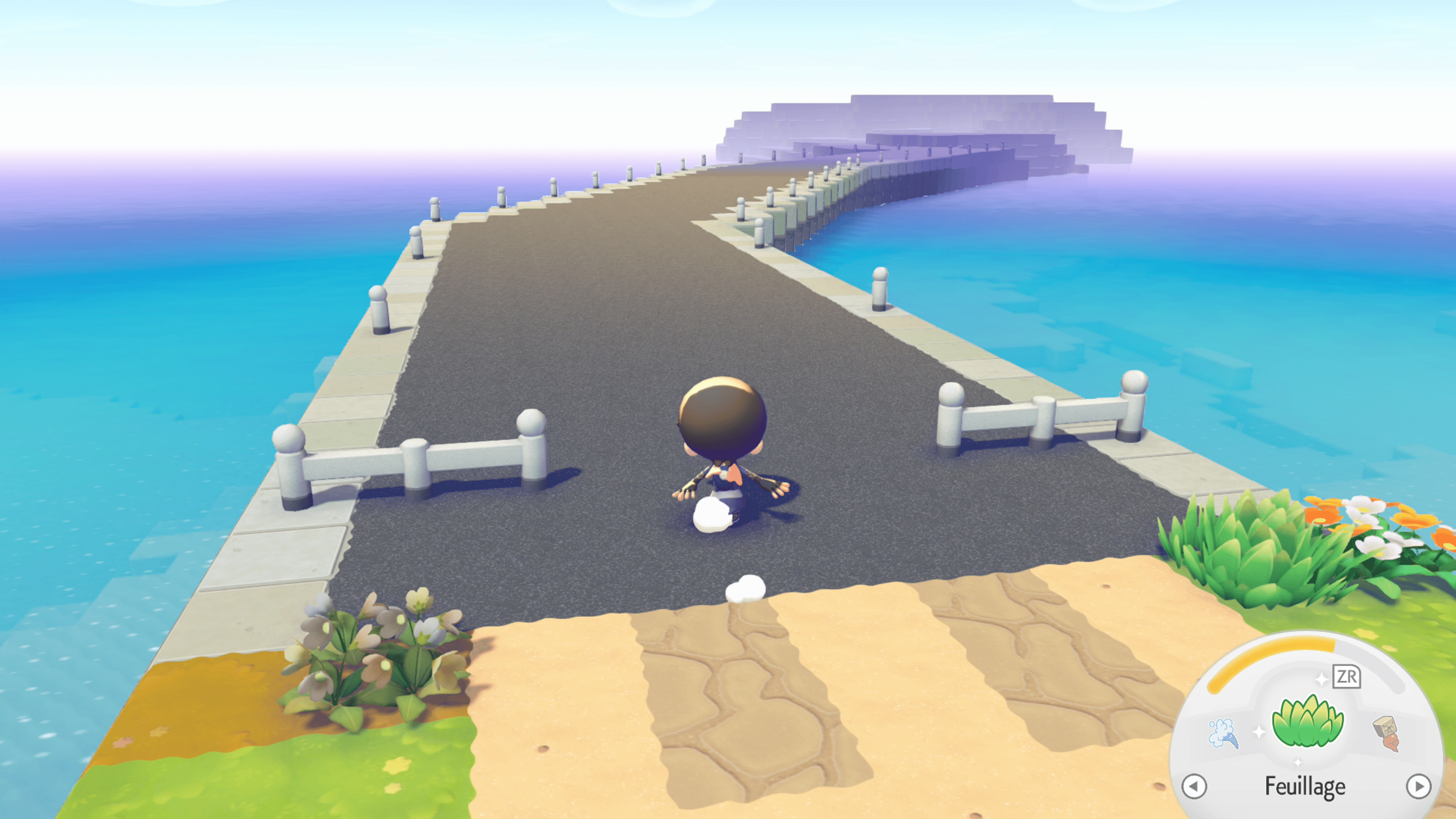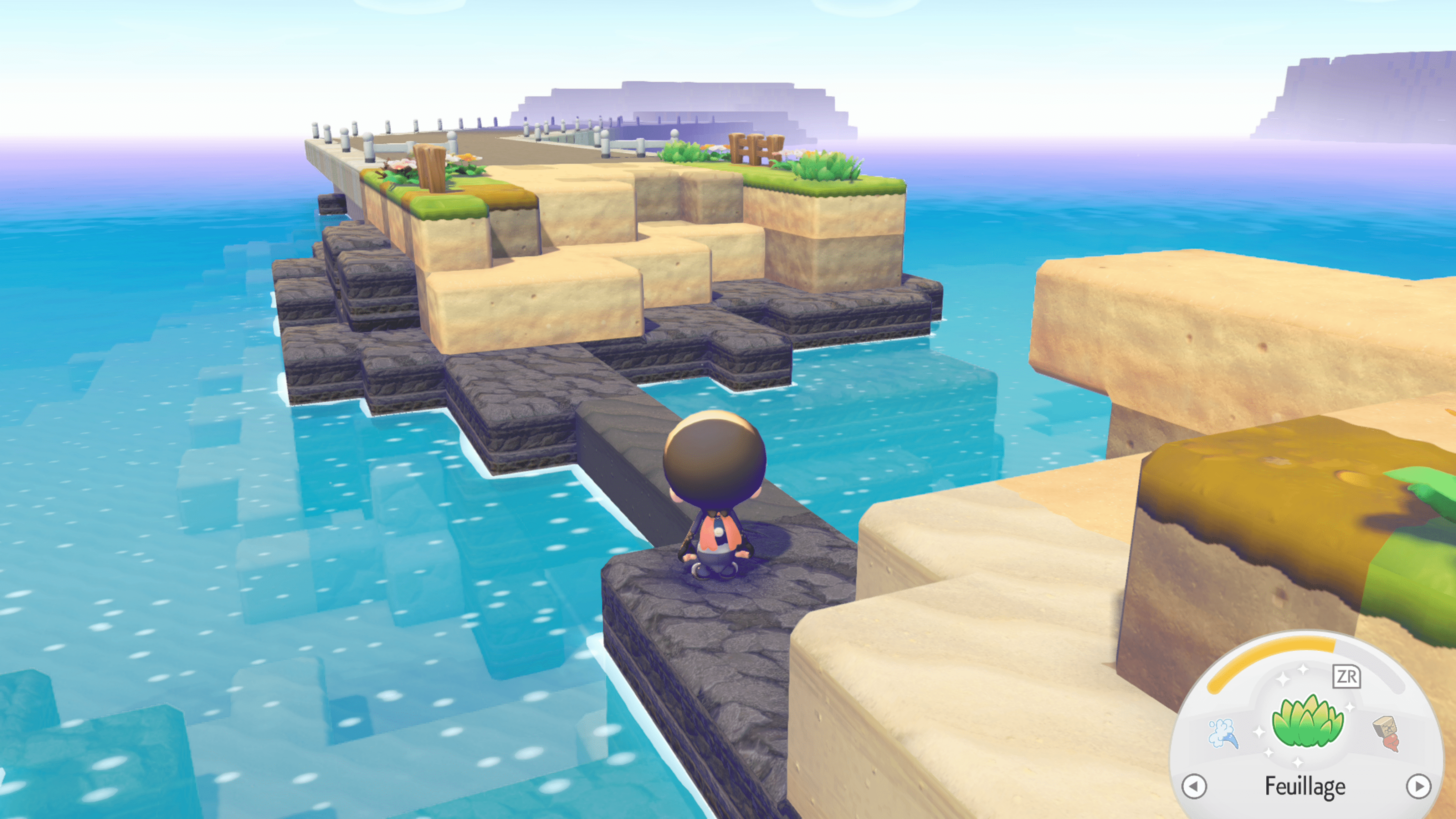 Une fois devant le pont, il vous faudra utiliser quelques blocs pour passer par dessus le trou béant. Avancez sur le pont, puis le jeu vous invitera à continuer. Il peut vous indiquer, selon votre avancée dans le jeu, qu’il n’est pas encore temps de vous y rendre ; ne vous inquiétez pas, il n’y a aucun spoil, le jeu préfère juste que vous ayez un peu plus d’expérience pour aller sur l’île GameShare.