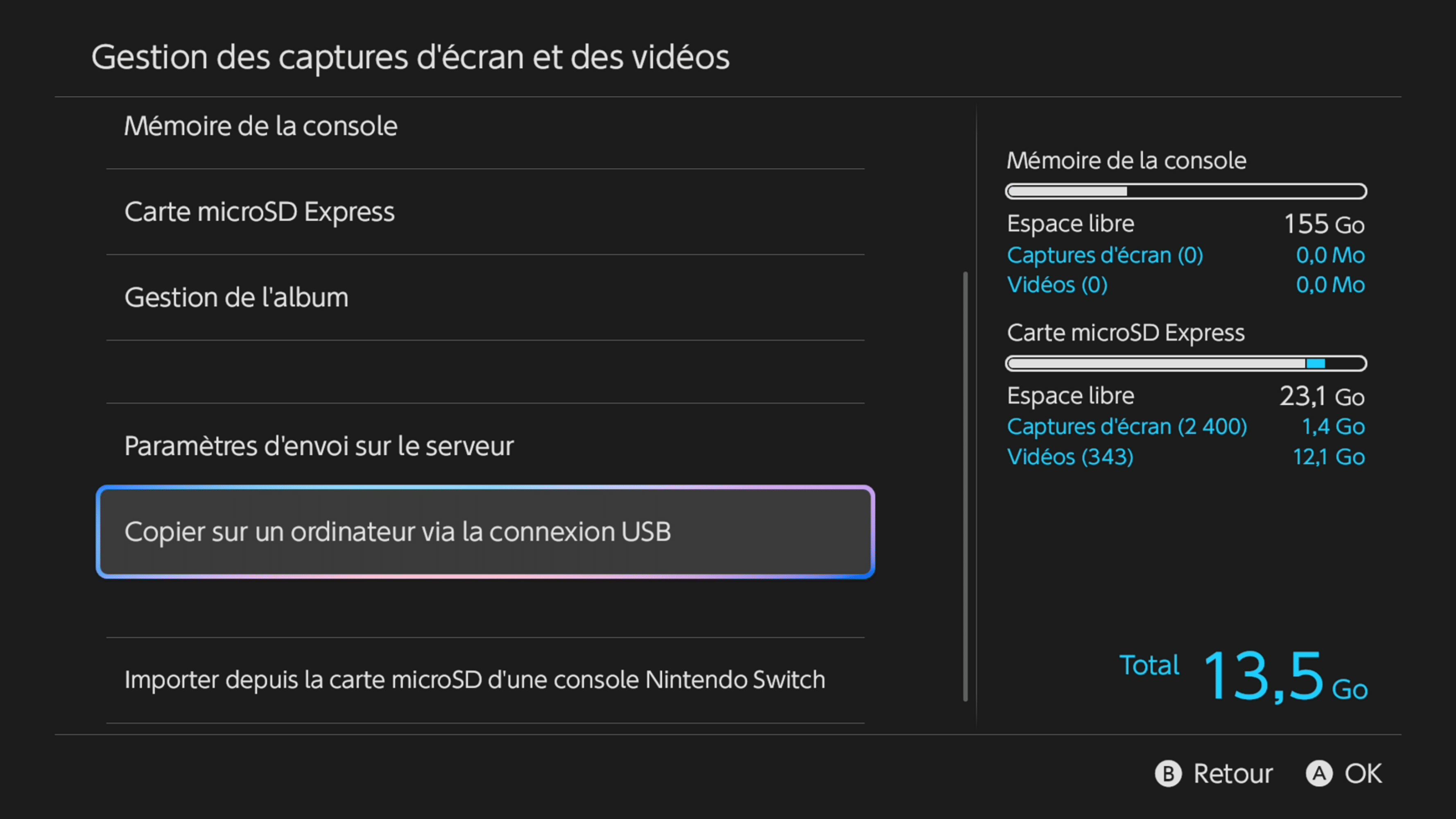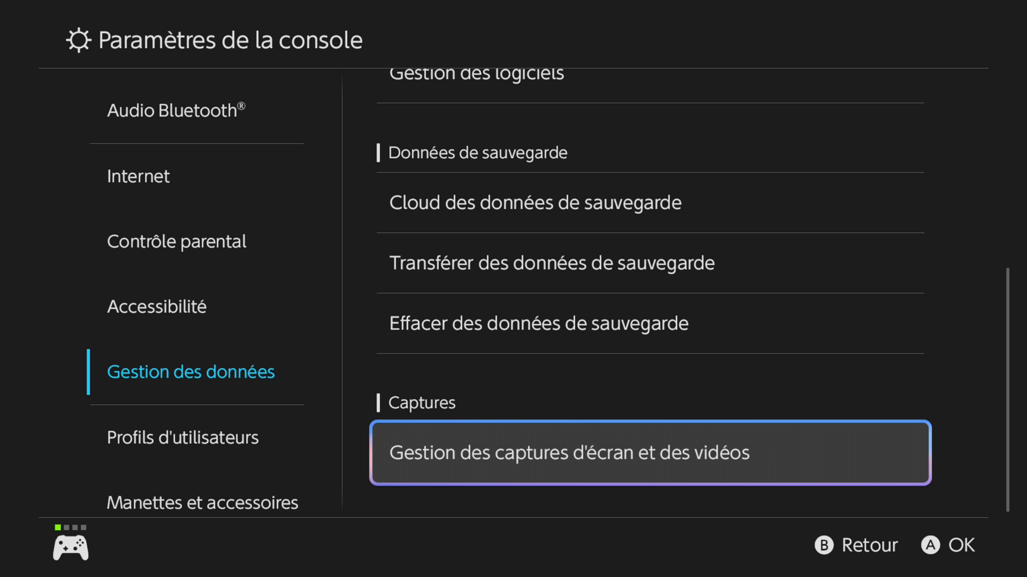 - Dans le menu de la console, rendez-vous dans « Gestion des données » > « Gestion des captures d’écran et des vidéos » > « Copier sur un ordinateur via la connexion USB » ;
