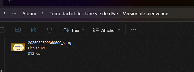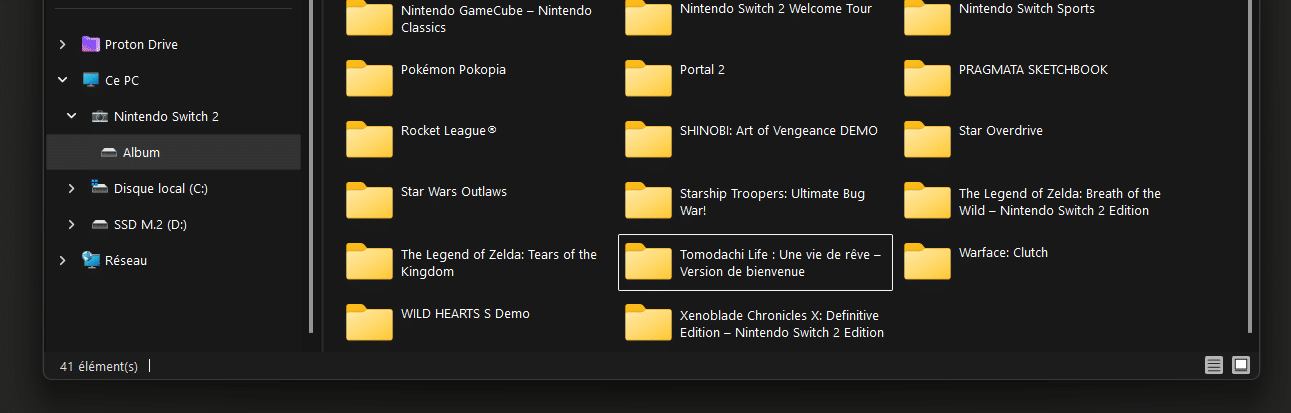 - Naviguez jusqu’au dossier Nintendo Switch / 2 > Album > « Nom du jeu » pour retrouver vos captures ;