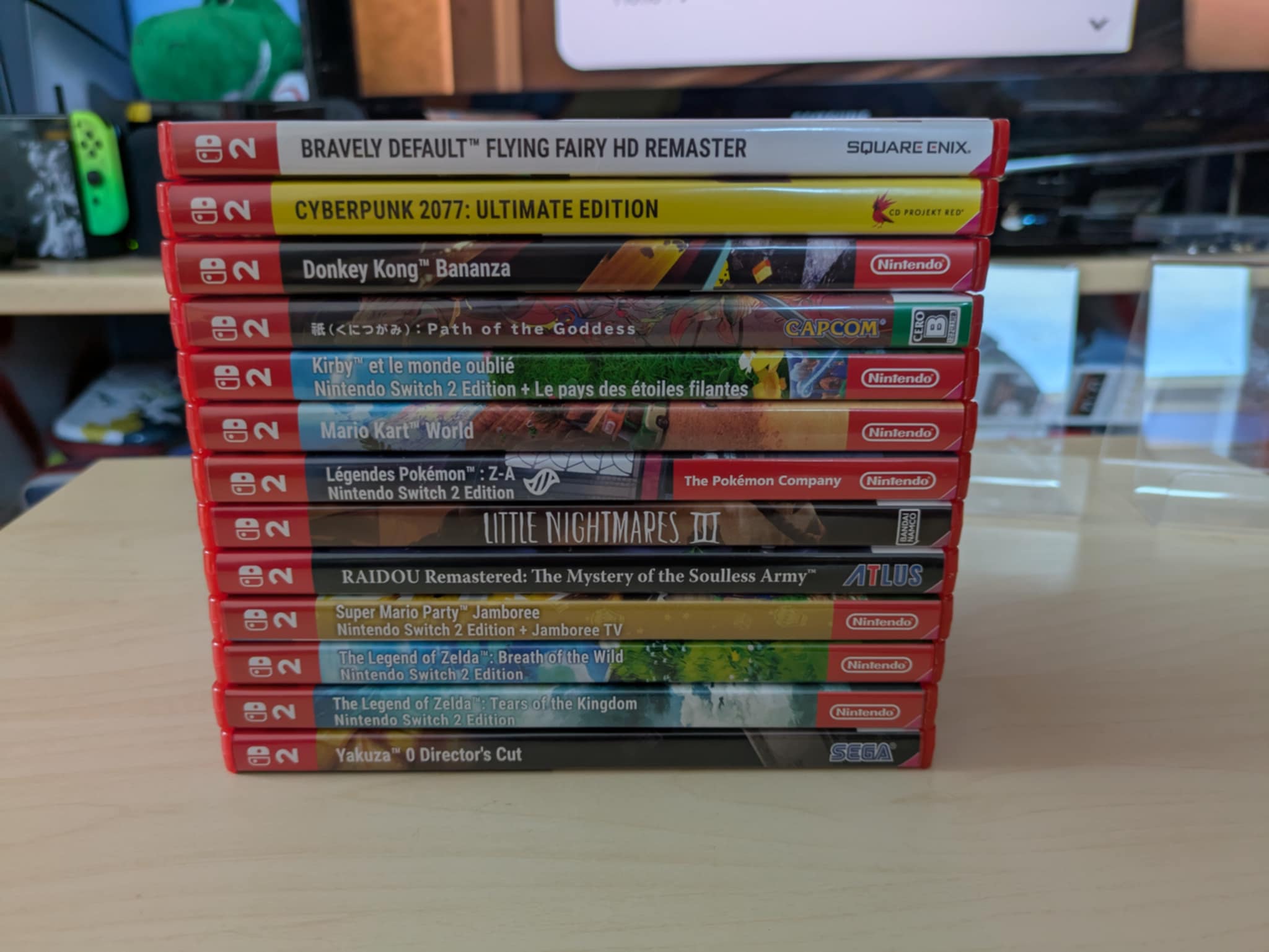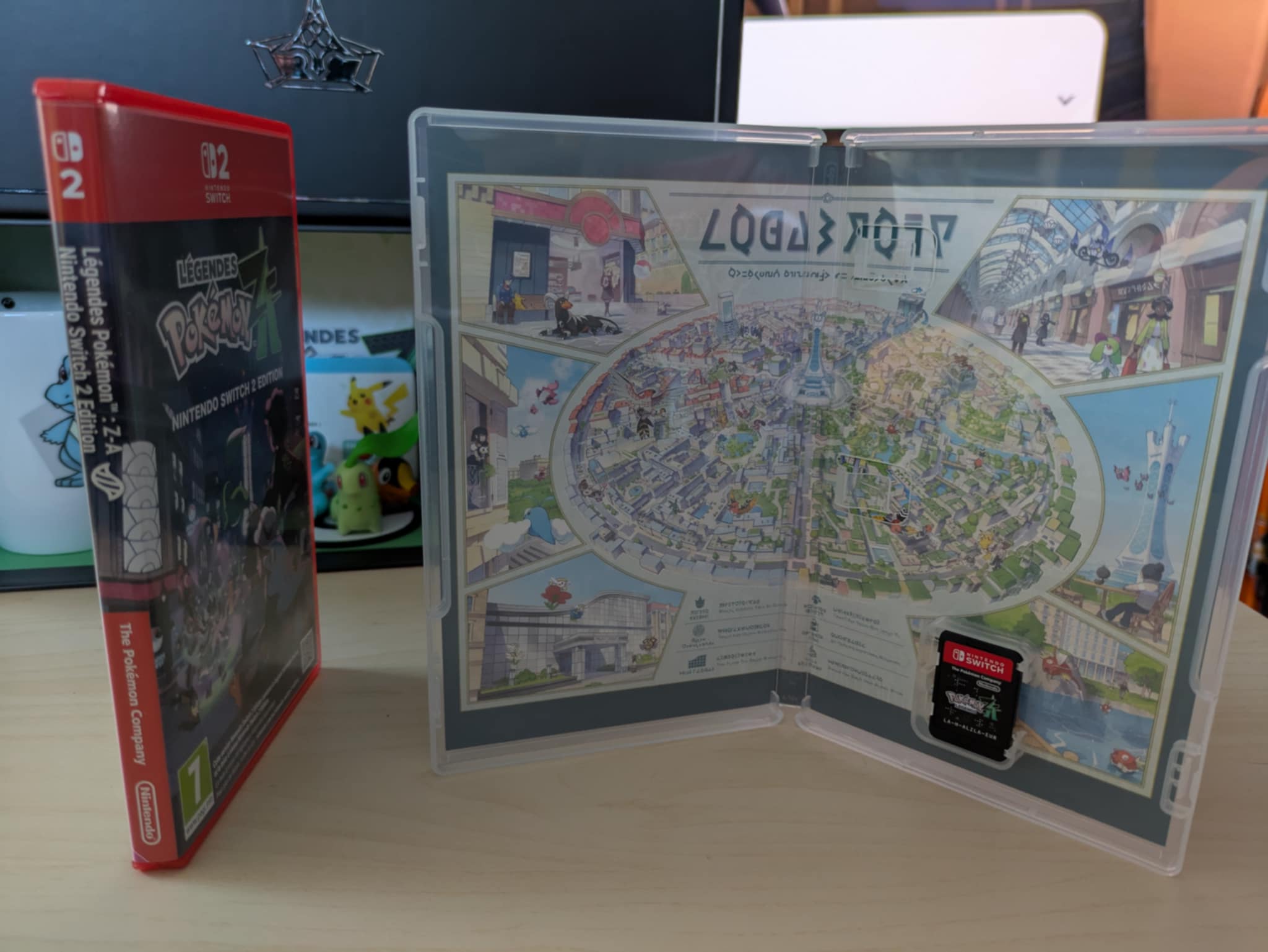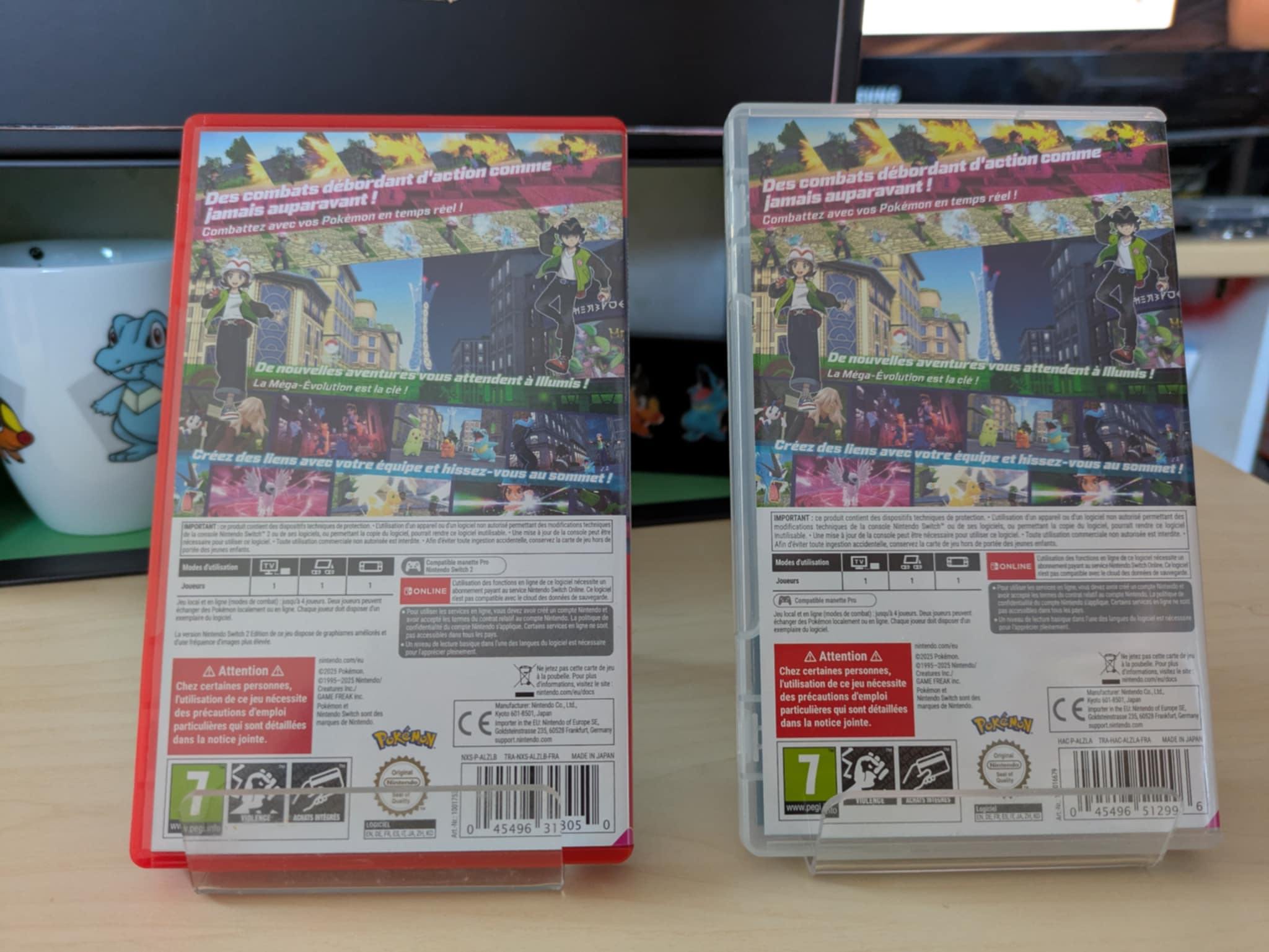 Légendes Pokémon Z-A est le premier titre Nintendo à sortir simultanément sur les deux plateformes : Switch et Switch 2, on retrouve donc deux boîtes sensiblement identiques. Les illustrations à l’avant, à l’arrière et à l’intérieur sont identiques, si ce n’est la présence des différents bandeaux sur la version Switch 2. On relève également une différence assez notable sur la tranche avec un grand bandeau rouge pour y inscrire les deux éditeurs (The Pokémon Company et Nintendo) donnant un résultat peu élégant dans une pile de jeux Nintendo Switch 2.