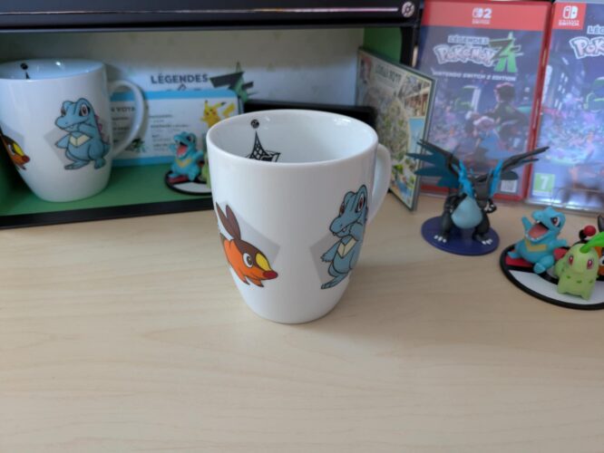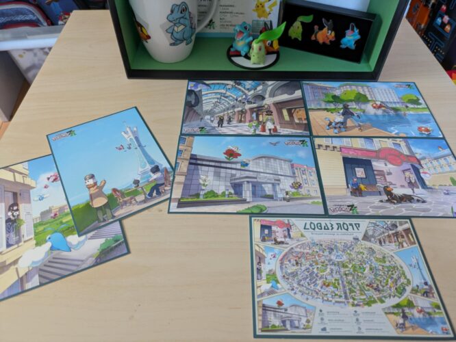 Déjà présenté sur le compte Twitter de Switch-Actu, nous avons eu la chance de recevoir le press-kit du jeu quelques jours avant sa sortie. L’ensemble des cadeaux sont contenus dans une jolie boîte ornée d’un logo de la ville d’Illumis, lieu où prend place l’intrigue de Légendes Pokémon Z-A. Cette dernière contient donc un mug à l’effigie des starters du jeu ainsi qu’une petite figurine et un set de pin’s représentant ces derniers. Et puisqu’on attribue à Paris cette légende de ville carte postale, ce sont septs petits paysages sur ce support qui nous sont proposés dans le press kit. Pour finir, toujours dans la thématique du jeu, une reproduction d’un billet de train avec destination Illumis se glisse dans la boîte, tout comme le personnage que l’on retrouve dans le train au début de l’aventure. Encore merci à Nintendo et son agence de presse pour nous avoir fait parvenir ce présent.