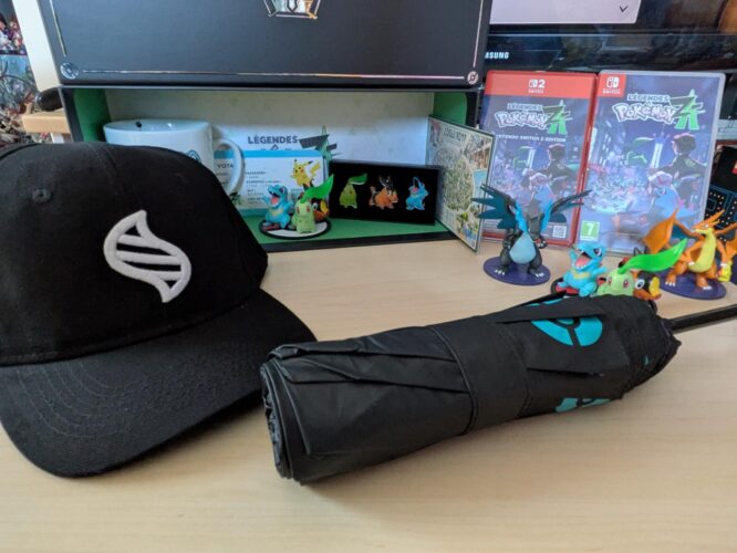 Pour terminer avec les différentes possibilités d’achats, Nintendo proposait sur son site un pack « choix de maître » à 85€ pour la version Nintendo Switch et à 95€ pour la version Nintendo Switch 2. Dans les deux cas, ce dernier se composait de trois petites figurines en plastique, reprenant les trois starters du jeu ainsi que les formes méga-évoluées de Dracaufeu. Le mug du press-kit était également disponible à l’achat dans ce pack. Pour finir, ce sont des accessoires pour lutter contre les intempéries qui étaient mis à disposition avec une casquette ornée du logo de la méga évolution ainsi qu’un parapluie avec plusieurs Pokémon dans leur forme finale.