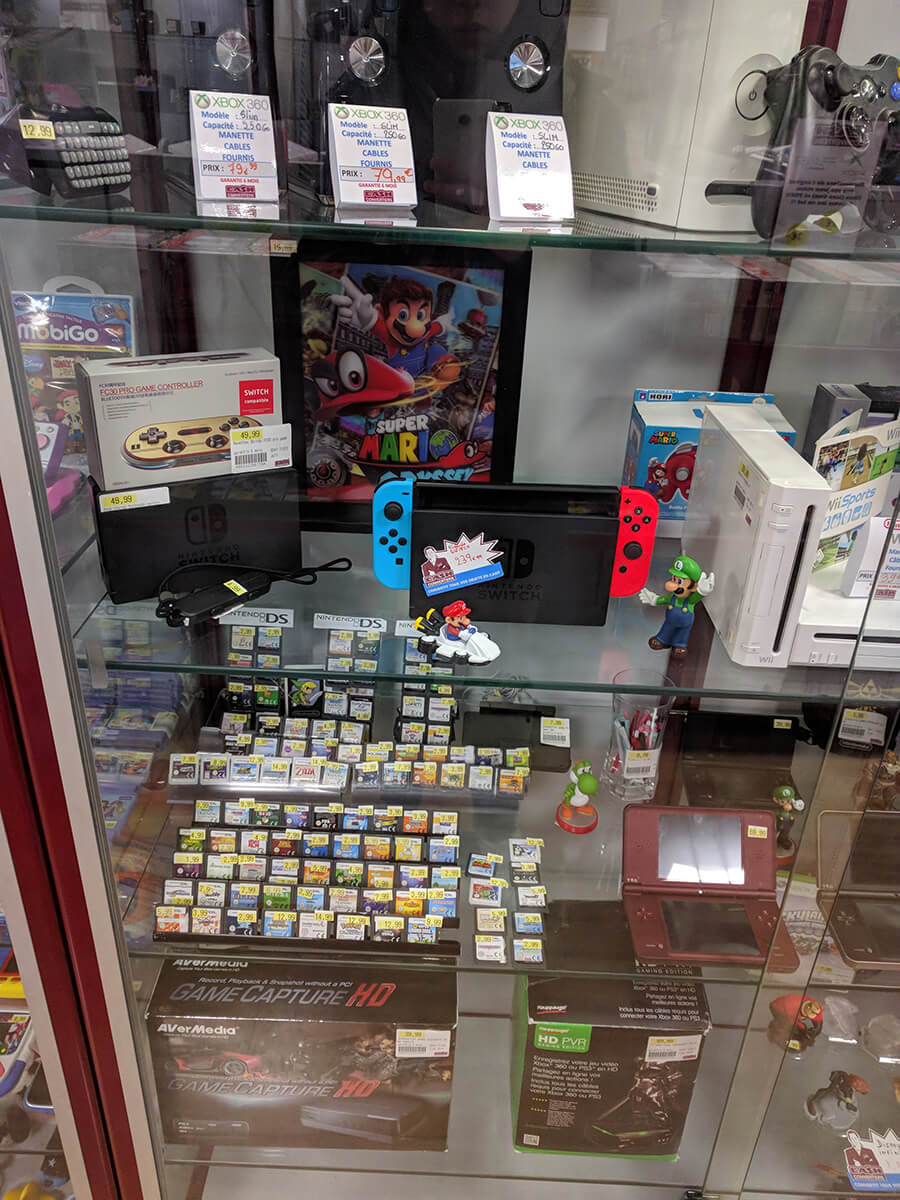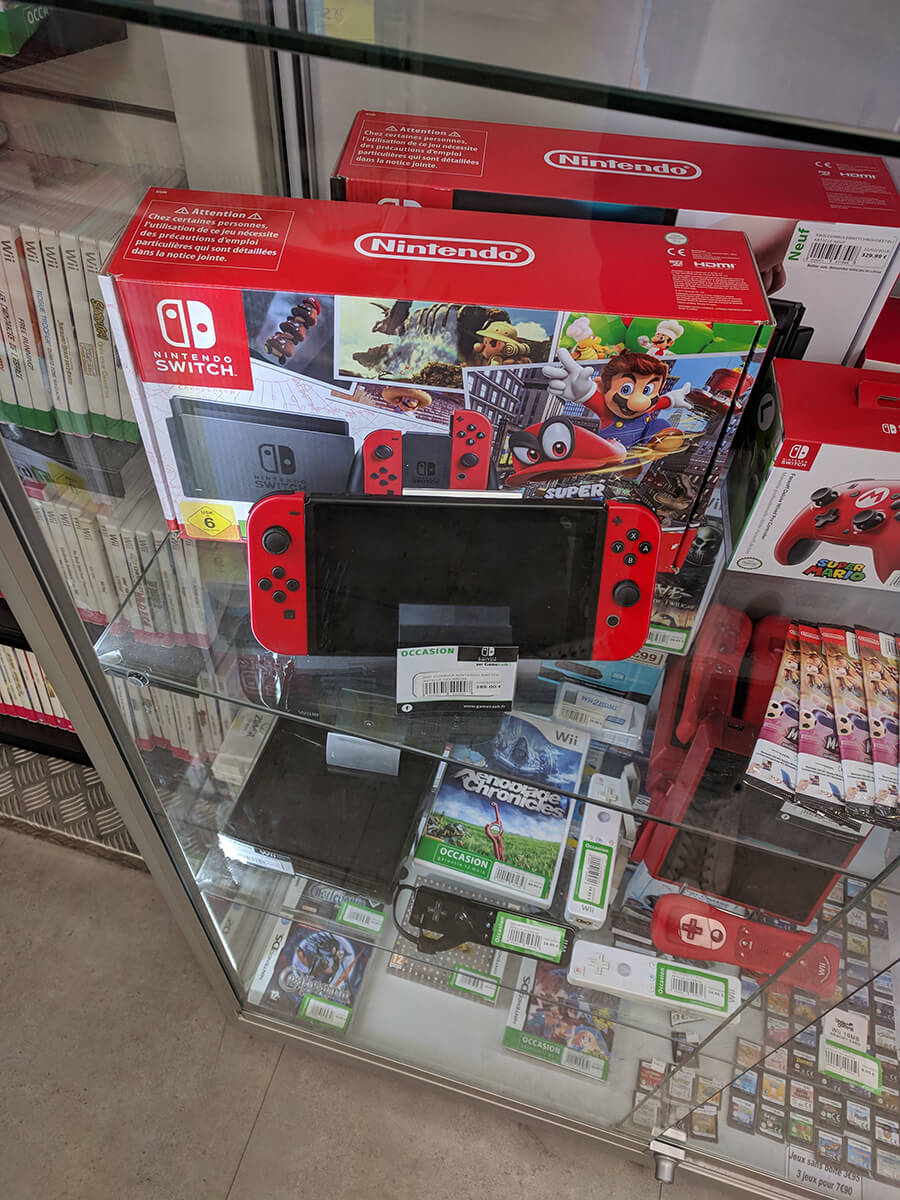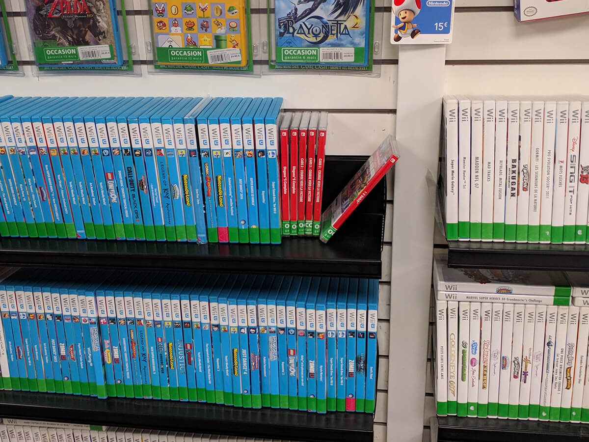 Sur 153 personnes, seules 38 ne rencontrent pas de difficultés à acheter des jeux d’occasion sur Nintendo Switch. Pour moi en tous cas, ma réponse a été la première des deux : il m’est très difficile de trouver mon bonheur en occasion. Je croise parfois un 1-2 Switch, parfois un Cars 3, mais rien d’intéressant. Les photos ci-dessous ont été prises par mes soins, et résument bien l’état du marché. Deux Switch (photos prises à quelques semaines d’écart), six jeux. Rien de plus, rien de moins. Tout cela perdu au milieu des Wii et des 3DS.