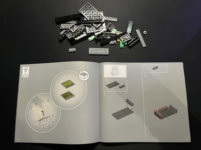 Pour ce petit set Game Boy, pas d’inquiétudes ; oui, des éléments seront proches mais rien n’est fastidieux. Qui plus est, de petites surprises très bien pensées sont au rendez-vous comme par exemple me montage des deux boutons rose en facade. Pour qu’ils soient « utilisables » (on peut appuyer dessus, même si rien n’est électronique évidemment), ils sont placés au-dessus d’un élastique tendu. Ainsi, le bouton remonte après avoir appuyé dessus. Tout bête, mais bien pensé. Je n’irais pas jusqu’à dévoiler toutes ces petites étapes qui font arborer un sourire, mais il en reste d’autres à découvrir pendant le montage.