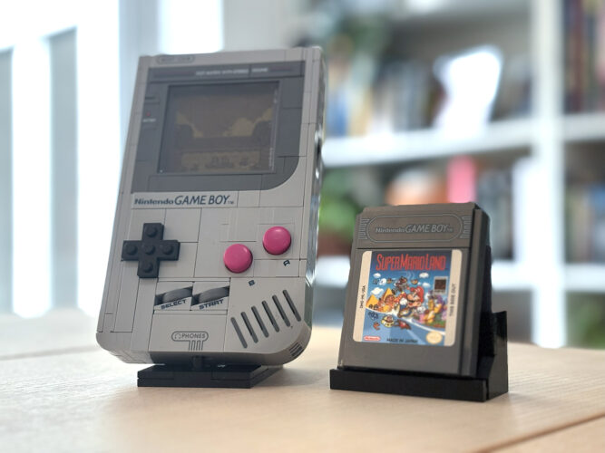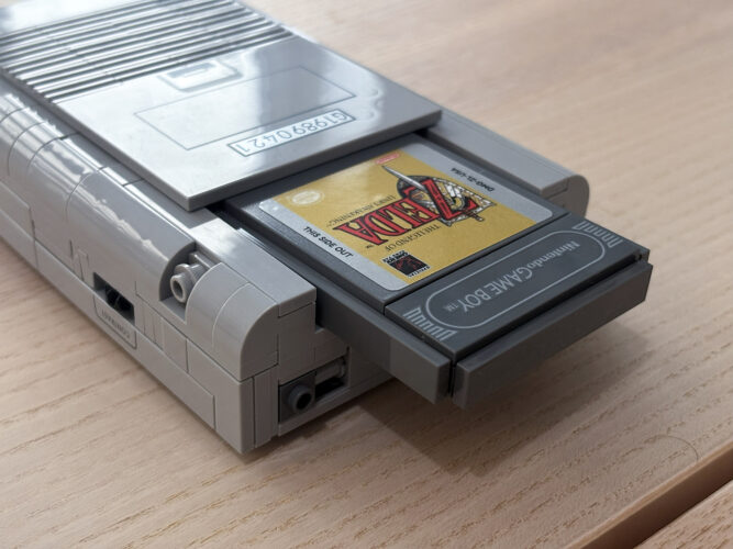 Une fois le montage terminé, le set donne vraiment une bonne impression générale : les pièces s’emboîtent bien (même si une partie en particulier, qui n’était pas fixée au reste, m’a fait croire que j’avais raté quelque chose), la structure est stable et la console tient debout sur son socle (bien qu’elle a tendance à bouger si vous la manipulez alors qu’elle est posée), que ce soit sur une étagère ou sur un bureau. Les détails comme les boutons, la croix directionnelle et même la petite cartouche sont bien pensés et apportent ce petit plaisir visuel qui fait sourire tout fan de Nintendo. Cela dit, il ne faut pas non plus s’attendre à un rendu parfait : le faux écran, par exemple, fait très “plastique” (c’est du plastique certes, mais le rendu n’est pas très bon) et manque un peu de charme comparé au reste du modèle. Notez également que ce set est assez rapide à monter, comptez deux bonnes heures.