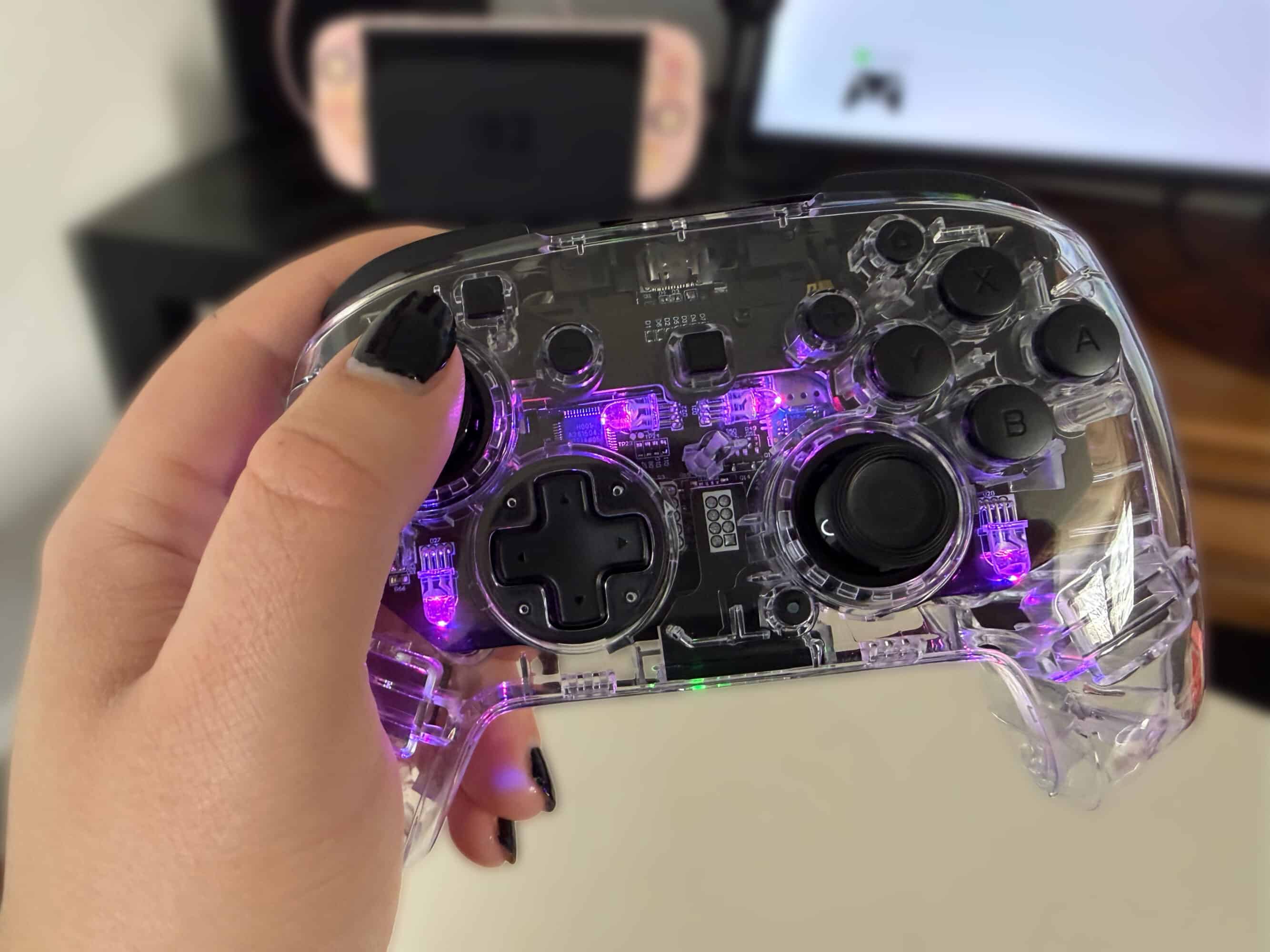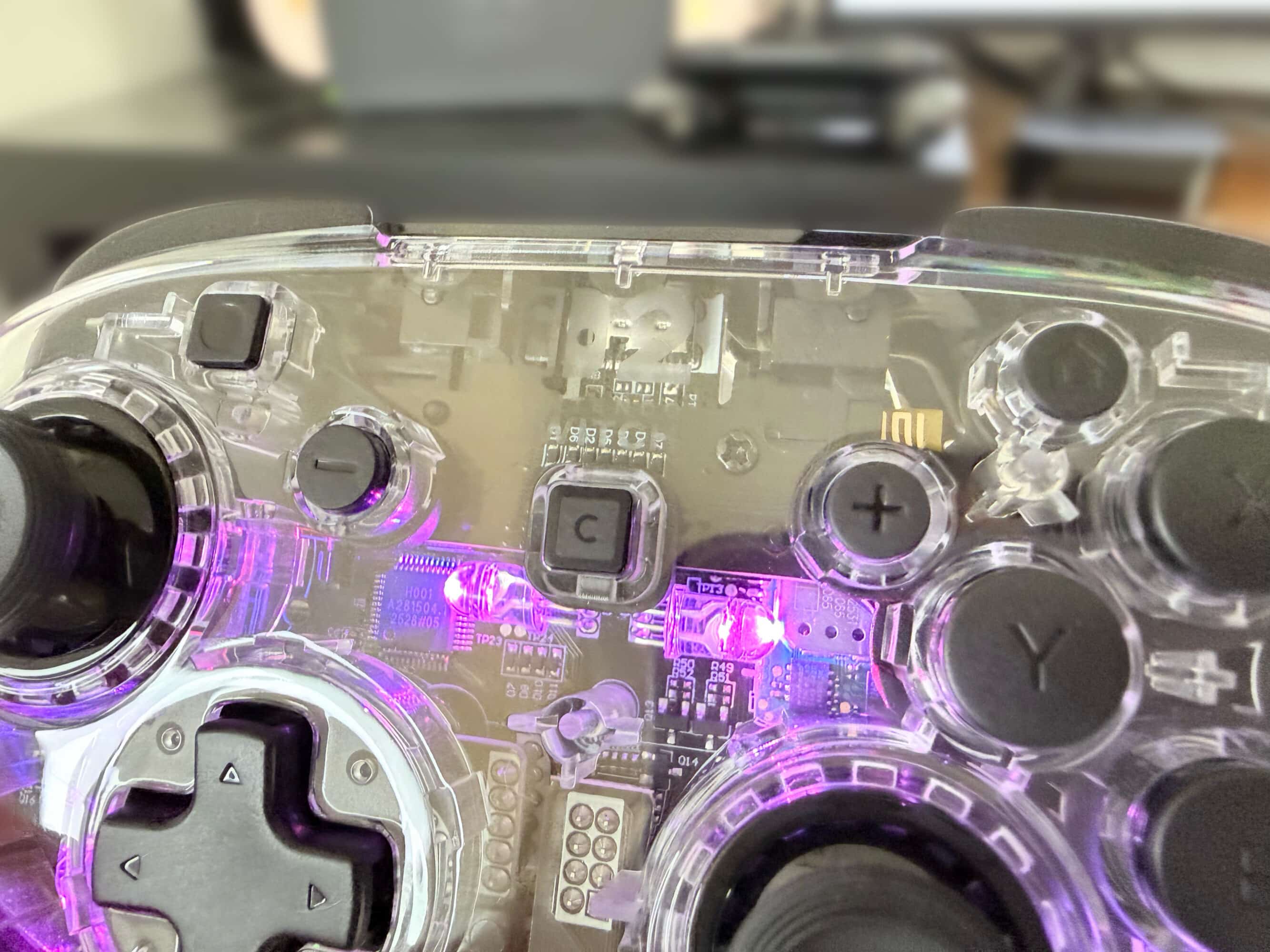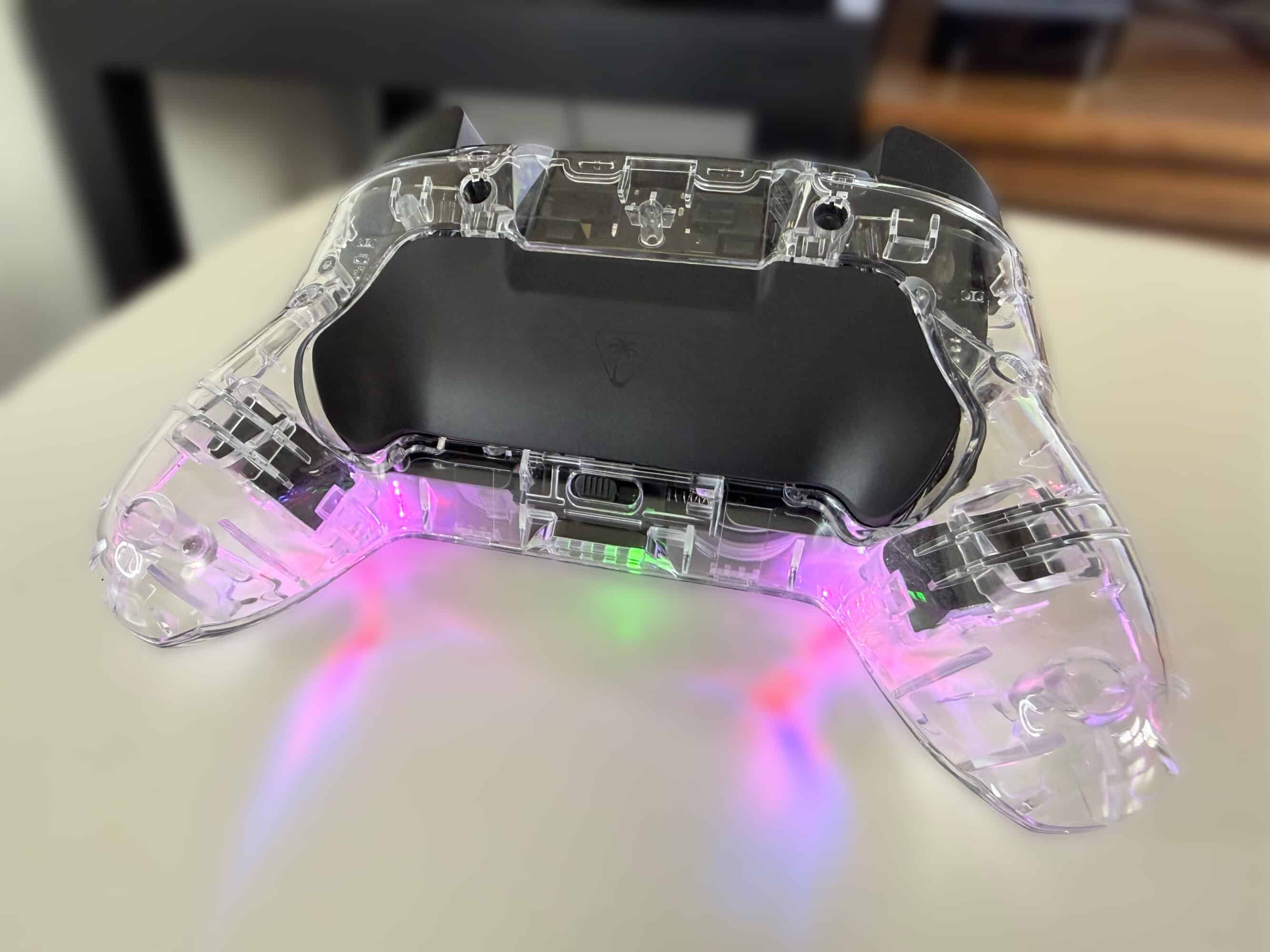 L’élément différenciant de cette manette sans fil Afterglow est celui qui saute le plus aux yeux dès que l’on déballe la boîte : un design totalement transparent, avec un effet iridescent qui laisse apparaître les composants internes et des LED dont on peut choisir la couleur via une combinaison de boutons. Regrettant la mode du hardware translucide des années 90, ce choix me convainc plutôt sur le papier… mais un peu moins en utilisation réelle. Le choix d’opter pour ce plastique transparent sur l’entièreté de la manette provoque deux petits problèmes. Le premier d’entre eux étant l’absence de grip : lors des longues sessions de jeu, l’on en vient à regretter ce choix, même si la manette n’est pas glissante et ne m’est jamais tombée des main. Le deuxième souci de ce plastique transparent est qu’il rend les LED très visibles et parfois un peu aveuglantes, alors qu’un plastique plus translucide aurait sans doute diffusé la lumière plus uniformément.