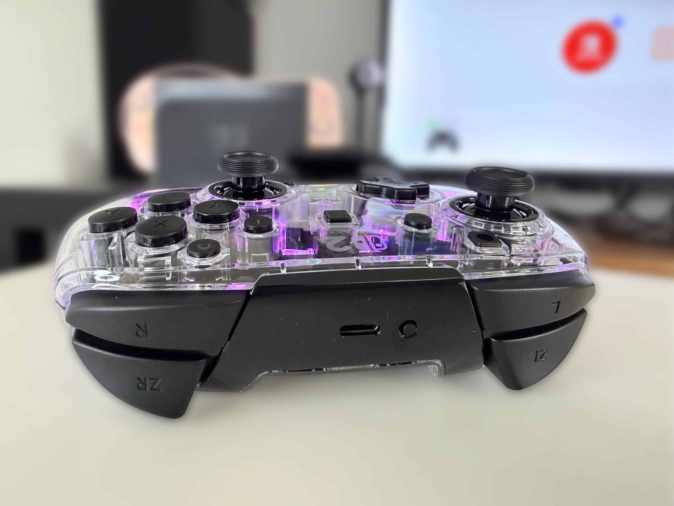 Avec quarante heures de jeu sur une charge complète, soit la même chose qu’une Manette Pro 2, la batterie est excellente et on peut oublier la manette pendant plusieurs jours sans devoir la brancher au câble USB-C fourni pour la recharger. À noter tout de même que les voyants de charge très lumineux peuvent se montrer distrayants dans le noir : j’ai dû à deux reprises débrancher la manette quand je voulais regarder un film sur ma télévision. On regrettera seulement l’absence de vibrations, une constante chez les manettes tierces sous licence officielle, qui me fait penser qu’il s’agit de quelque chose d’imposé par Nintendo, peut-être par volonté de ne pas partager leur technologie propriétaire de vibrations HD.