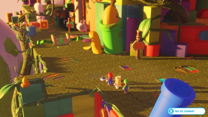 C’est en choisissant trois têtes de cette joyeuse troupe que vous menerez les batailles proposées par le jeu. Reprenant les codes de la célèbre série X-COM, Mario + The Lapins Crétins vous lance dans d’excellents combats où tout a été minutieusement mis en place. Les actions possibles pour chaque personnage sont classées en trois catégories : les déplacements, les attaques et les aptitudes. En déplaçant vos personnages, vous avez plusieurs possibilité : un déplacement simple, une glissade qui blessera les ennemis sur votre chemin et un saut d’équipe qui vous permettra de vous déplacer plus loin ou même de gagner des hauteurs. Les combats imposent divers objectifs tels qu’une élimination complète de vos ennemis ou encore une escorte d’un personnage tiers.