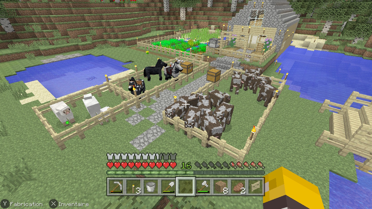 Minecraft propose également d’autres formes d’amusement. Des animaux sont éparpillés à travers le monde, allant de la simple poule à de beaux chevaux, en passant par des cochons ou encore des lapins. Une fois tués (désolé), la plupart d’entre eux proposent des ressources importantes : de la viande pour chacun d’entre eux, de la laine pour les moutons (afin de créer un lit ou de la moquette) ou même du cuir pour la vache (utiles pour les premiers équipements ou pour créer des livres, qui eux seront utiles plus tard encore). Les chevaux quant à eux, équipés d’une selle trouvée dans un donjon, peuvent être chevauchés. Pour finir, deux animaux de compagnie existent : les loups, apprivoisés en chiens grâce à des os, et les ocelots, apprivoisés en chats grâce à du poisson. Le premier fait fuir les squelettes, le second les creepers.