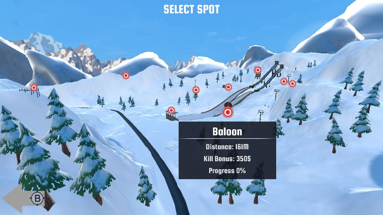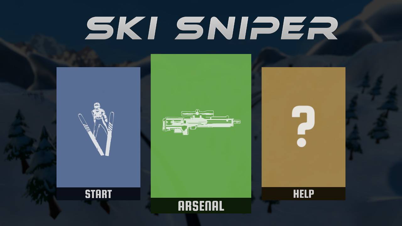 L'époque est au minimalisme et l'interface de Ski Sniper s'insère bien dans celle-ci : trois options de jeu s'offrent à vous lorsque vous démarrez le titre de Crazy Rocks : « Start », qui vous permet de lancer la partie, « Arsenal » qui vous permet de jouer avec un club anglais qui ne gagnera jamais plus aucun titre personnaliser votre armement et « Help », qui vous permettra d'obtenir une aide sommaire portant sur les contrôles. Vous allez me dire que c'est peu, ce à quoi je répondrais que ce n'est pas la taille qui compte : en effet, le mode « Start » vous permet de dégommer du skieur depuis pas moins de neuf spots différents !
