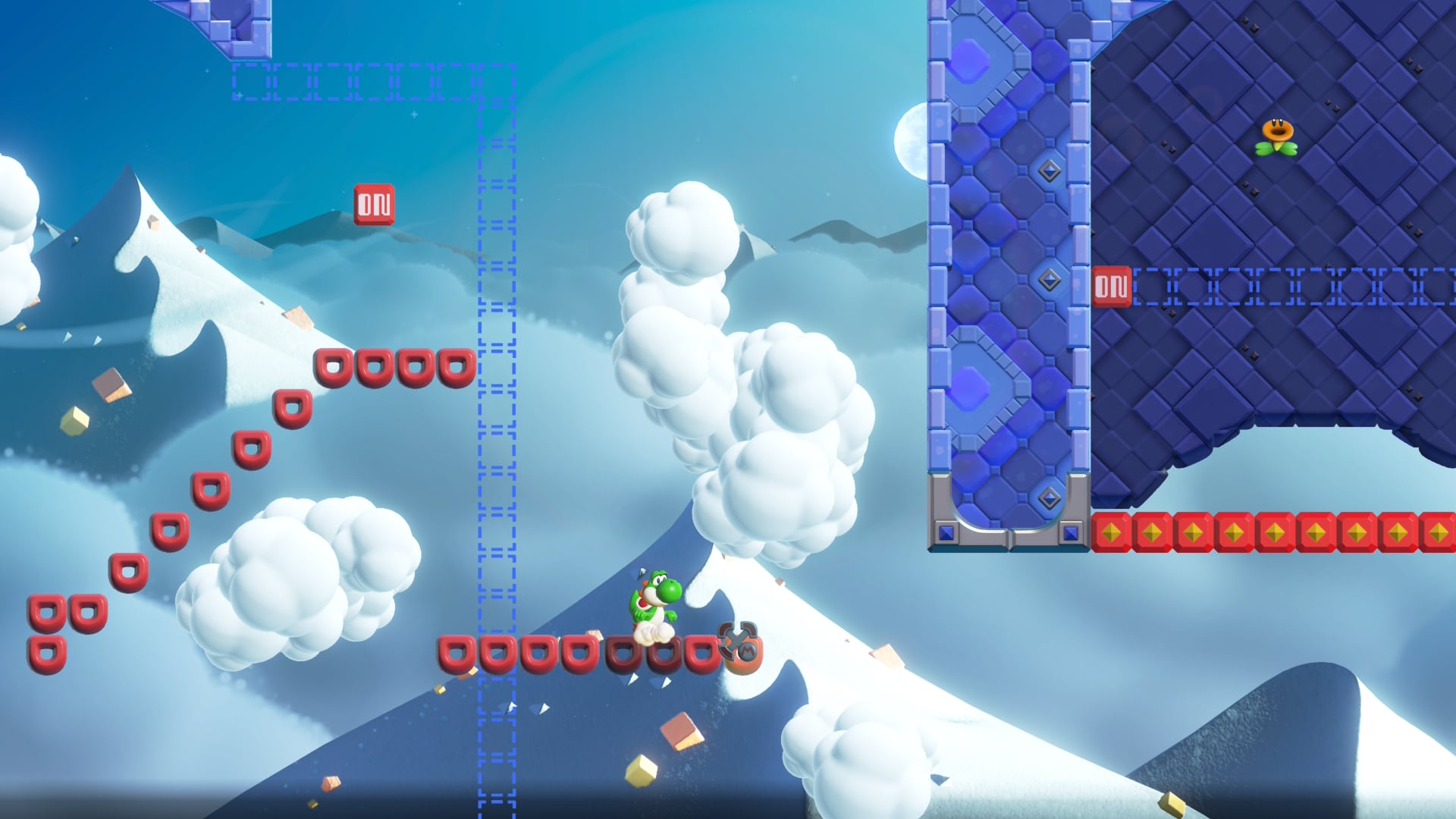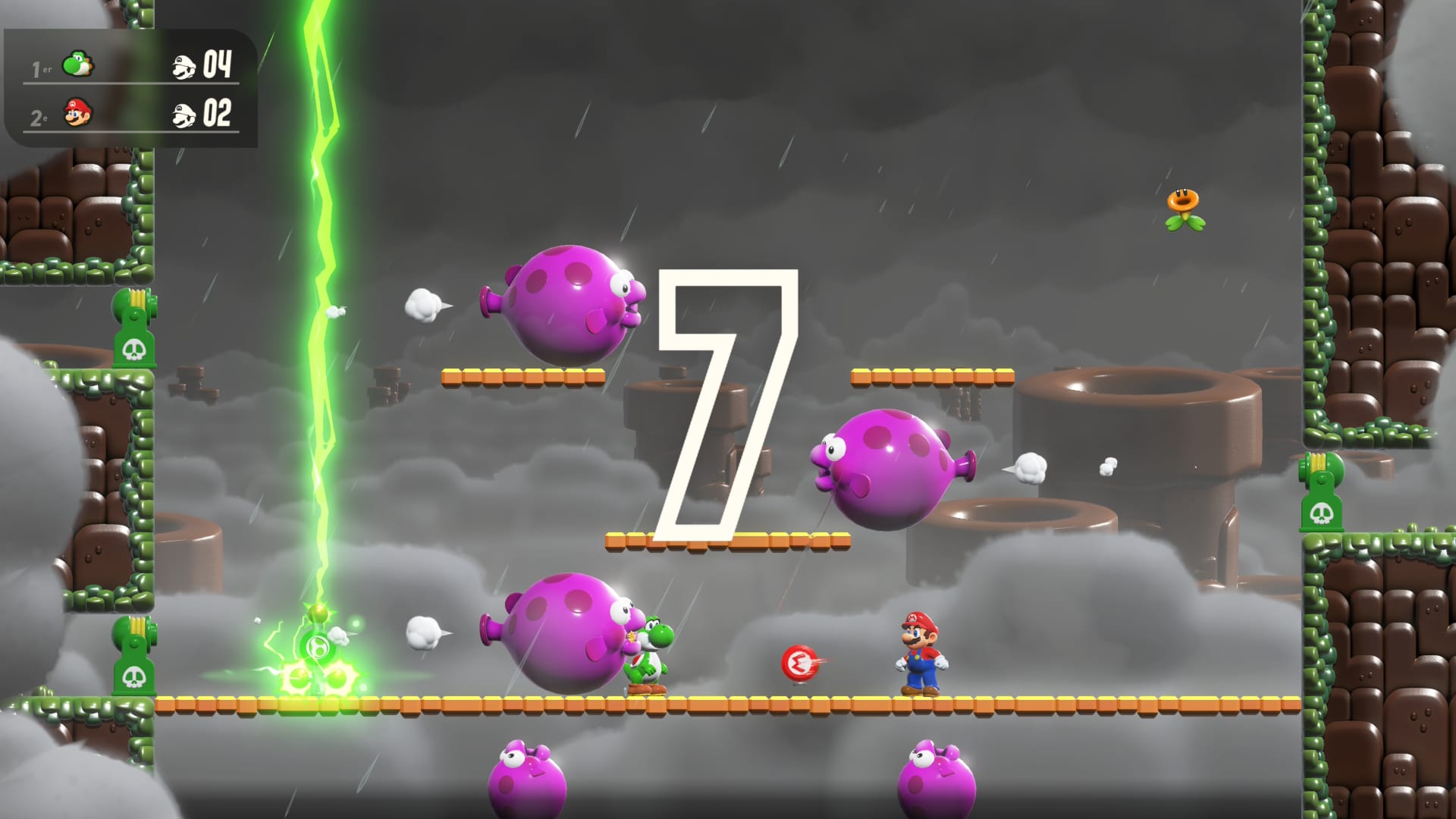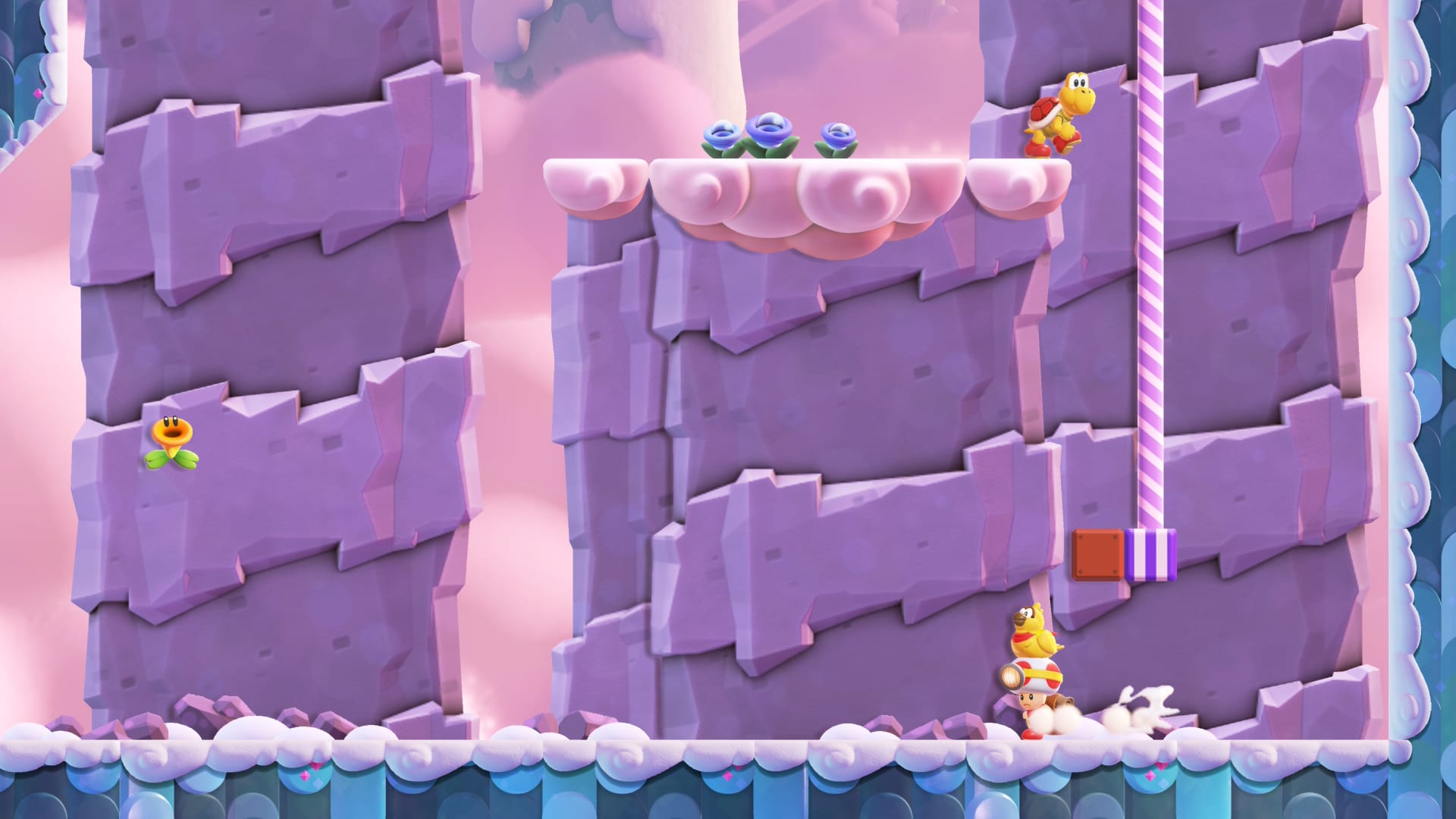 Avant d’arriver aux combats, Mario devra commencer par parcourir un nouveau niveau, qui exploite généralement la nouvelle transformation de cette extension : la fleur. Pour ce qui est des niveaux, ils sont dans l’ensemble assez oubliables avec bien souvent uniquement le besoin d’aller tout droit vers la fin du niveau. Le pouvoir quant à lui peut se montrer intéressant, mais semble assez sous-exploité dans cette extension, puisqu’il permet d’envoyer de grandes fleurs vers le haut, éliminant l’ensemble des ennemis sur son passage.
