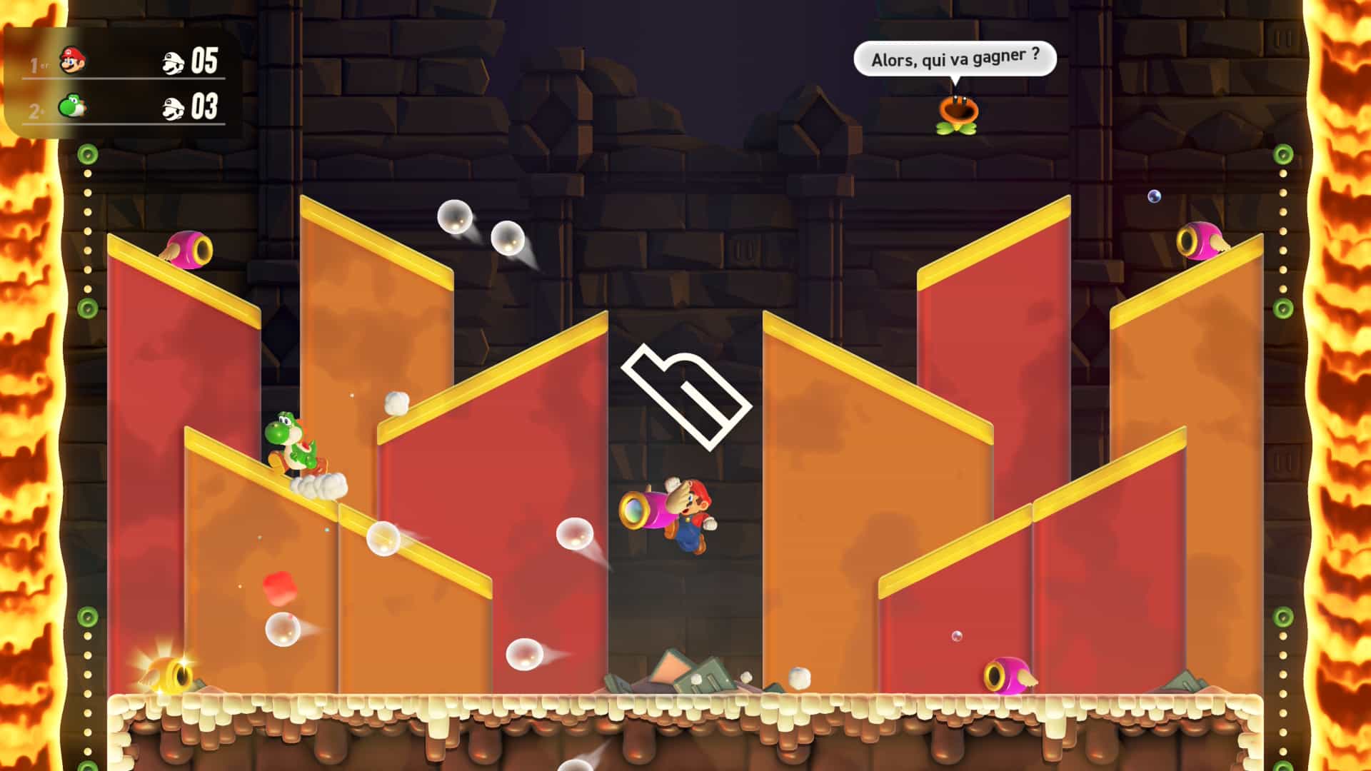 Malgré toutes ses grandes qualités, on pouvait regretter quelques points concernant ce Mario Wonder dans sa version originale. Tout d’abord, la difficulté était relativement absente pour des joueurs confirmés. L’ensemble des niveaux était une promenade de santé alors que seul le dernier monde proposait quelques niveaux à la difficulté un peu plus relevée. L’autre point un peu dommage dans un jeu proposant autant d’inventivité se trouvait au niveau des affrontements contre les boss. L’entièreté des combats de ce genre était contre Bowser Jr. et s’avérait extrêmement simple, jusqu’au dernier boss qui avait au moins une mise en scène particulièrement réussie.