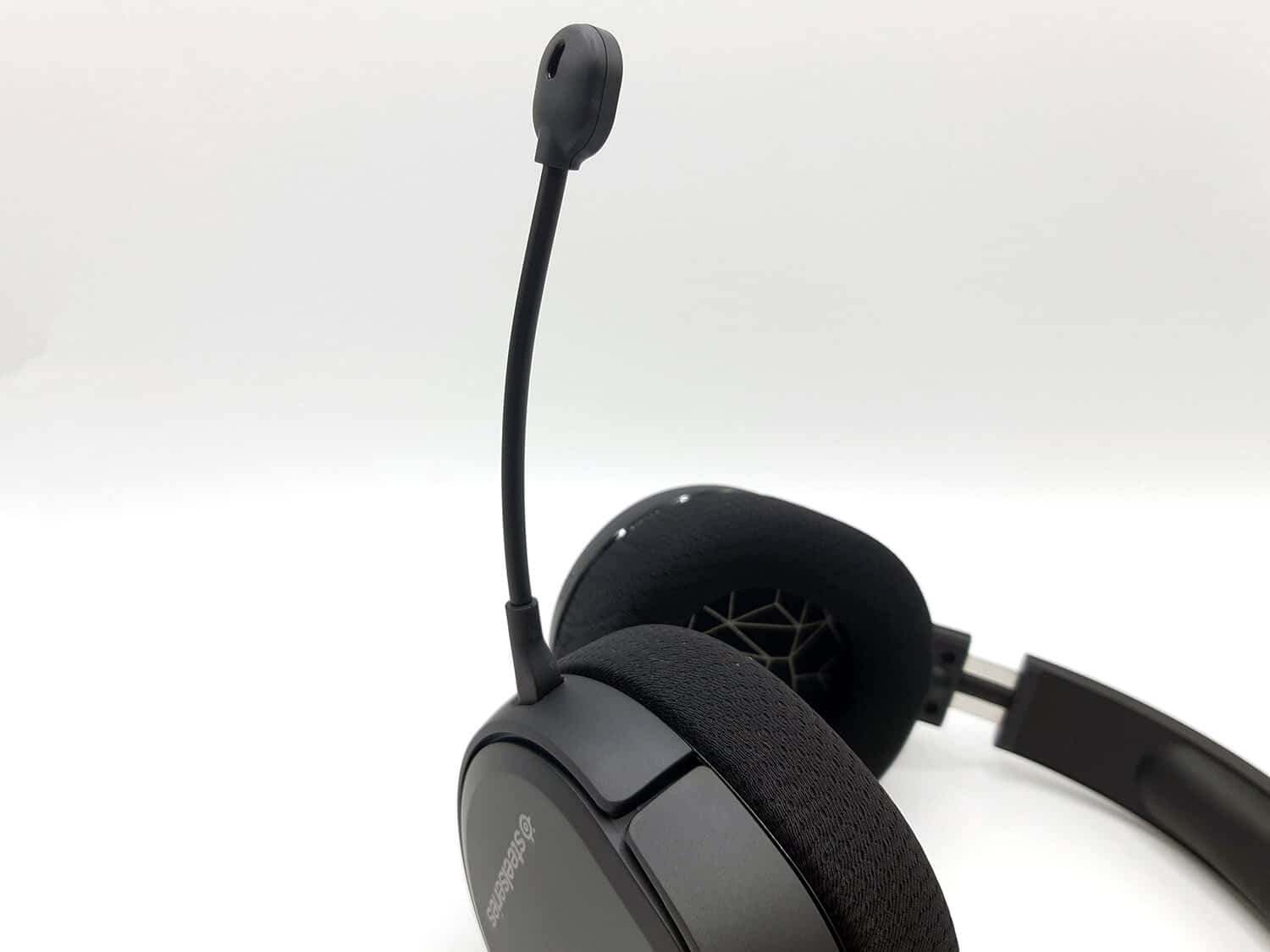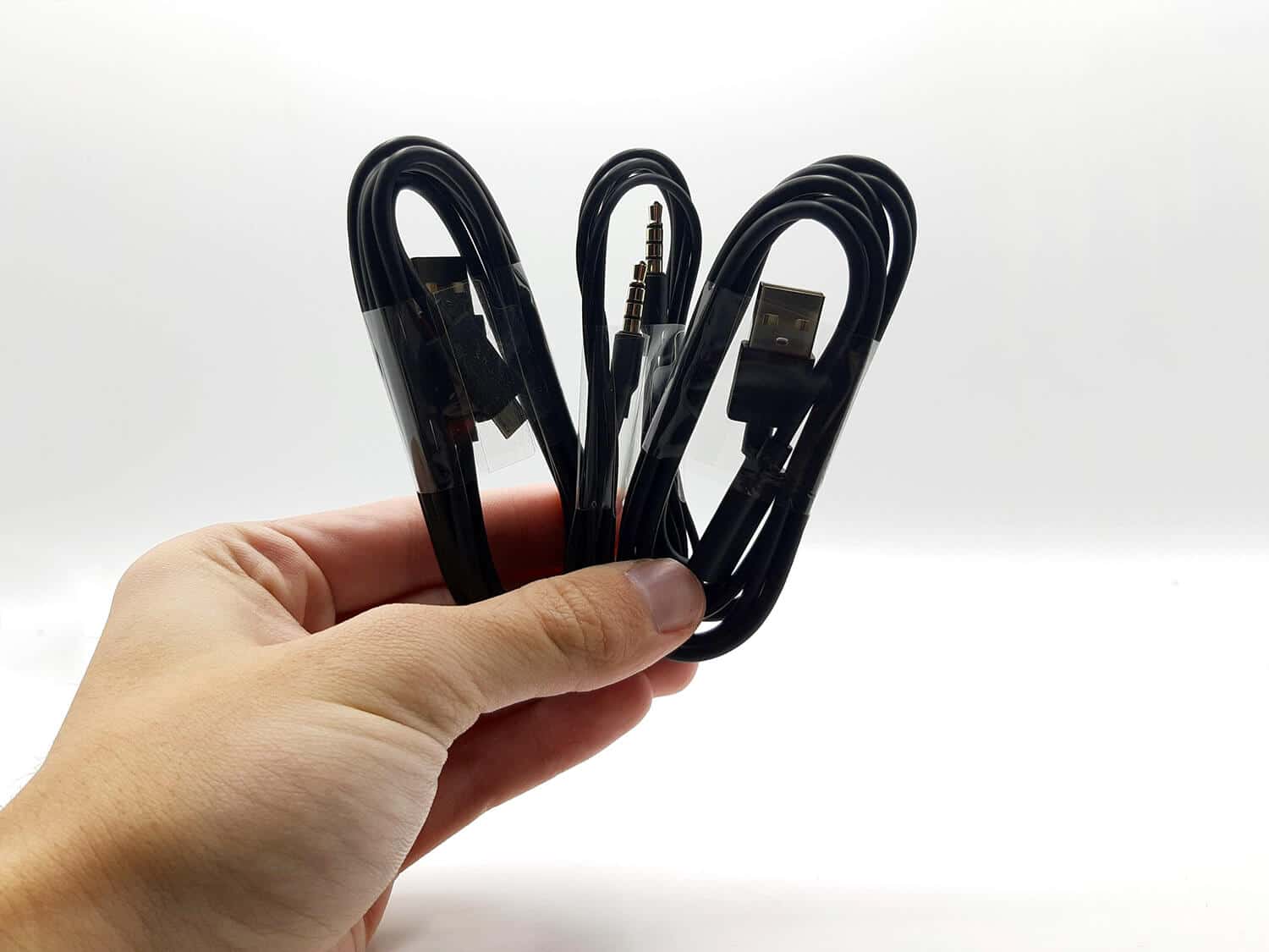 Puisqu’il s’agit d’un casque sur batterie, deux autres câbles sont également prévus dans la boîte de cet Arctis 1 Wireless, à savoir un câble de charge micro-USB et un câble Jack, permettant pour ce second de profiter du son de votre jeu même lorsque vous n’avez plus de batterie dans le casque ou tout simplement pour l’utiliser sur une machine qui ne dispose pas des ports nécessaires au bon fonctionnement du dongle. Pour finir, un micro est disposé lui aussi avec le casque et, lorsqu’il est branché à l’emplacement prévu pour, il permet tout simplement de discuter dans les jeux compatibles (comme Fortnite, par exemple).