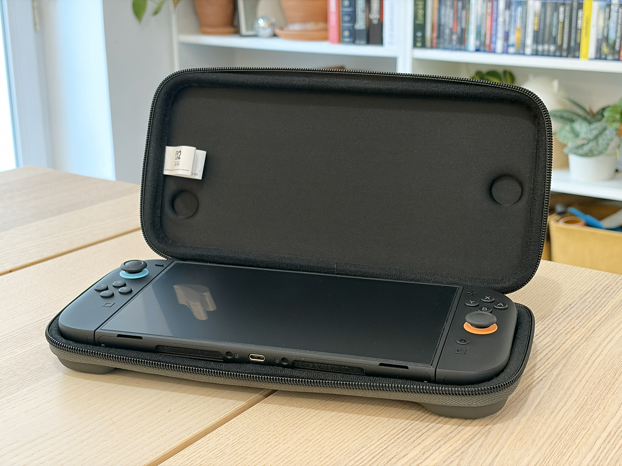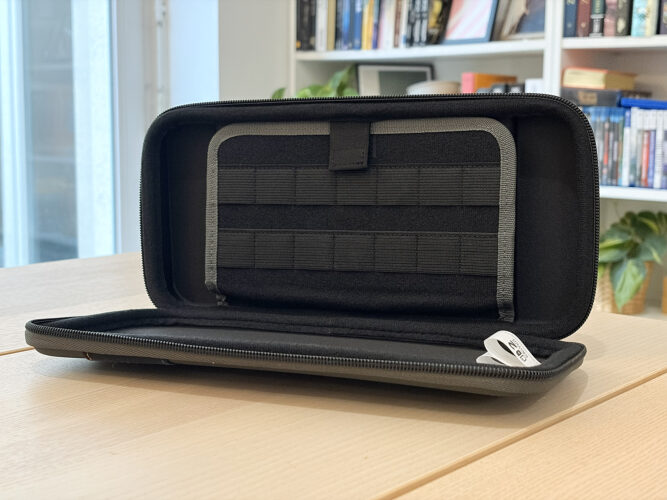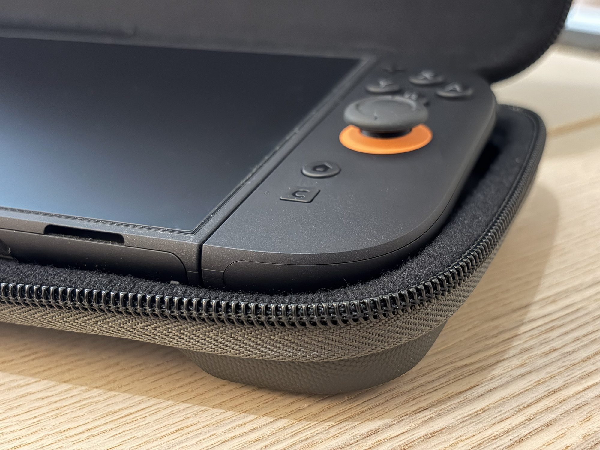 Mais forcément, une telle finesse pensée sur mesure amène à quelques problèmes, pas forcément majeurs mais toujours bons à rappeler. Premièrement, oubliez toute possibilité d’y ranger une Nintendo Switch 2 qui aurait une coque « grip » sur les Joy-Con 2. Vous pourrez peut-être faire passer le tout en forçant, mais l’intérêt n’est pas là et pourrait augmenter le risque de casse lors d’un choc. Ensuite, impossible d’y ranger une dragonne ou tout autre petit accessoire : il y a la place pour la console, pour 14 cartouches, et c’est tout. Enfin, et c’est évident, une pochette aussi fine protégera toujours moins que quelque chose de plus épais et matelassé ; notons malgré tout que le rabat qui permet de contenir les cartouches apporte une protection supplémentaire à l’écran. Mais difficile d’en faire de vrais points négatifs, puisque c’est inhérent à ce type d’étui.