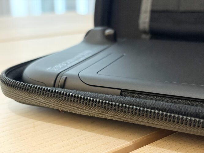 Le seul vrai défaut que je peux reprocher à ce produit de Turtle Beach, c’est la matière utilisée pour la bande à l’avant de la pochette. Si le design global est, je trouve, vraiment réussi, cette petite bande a tendance à attraper toutes les poussières et les poils d’animaux sur son passage. Si vous avez, par exemple, un chat qui aime aller examiner tout ce qu’il peut, vous allez devoir vous munir d’une brosse anti poils.