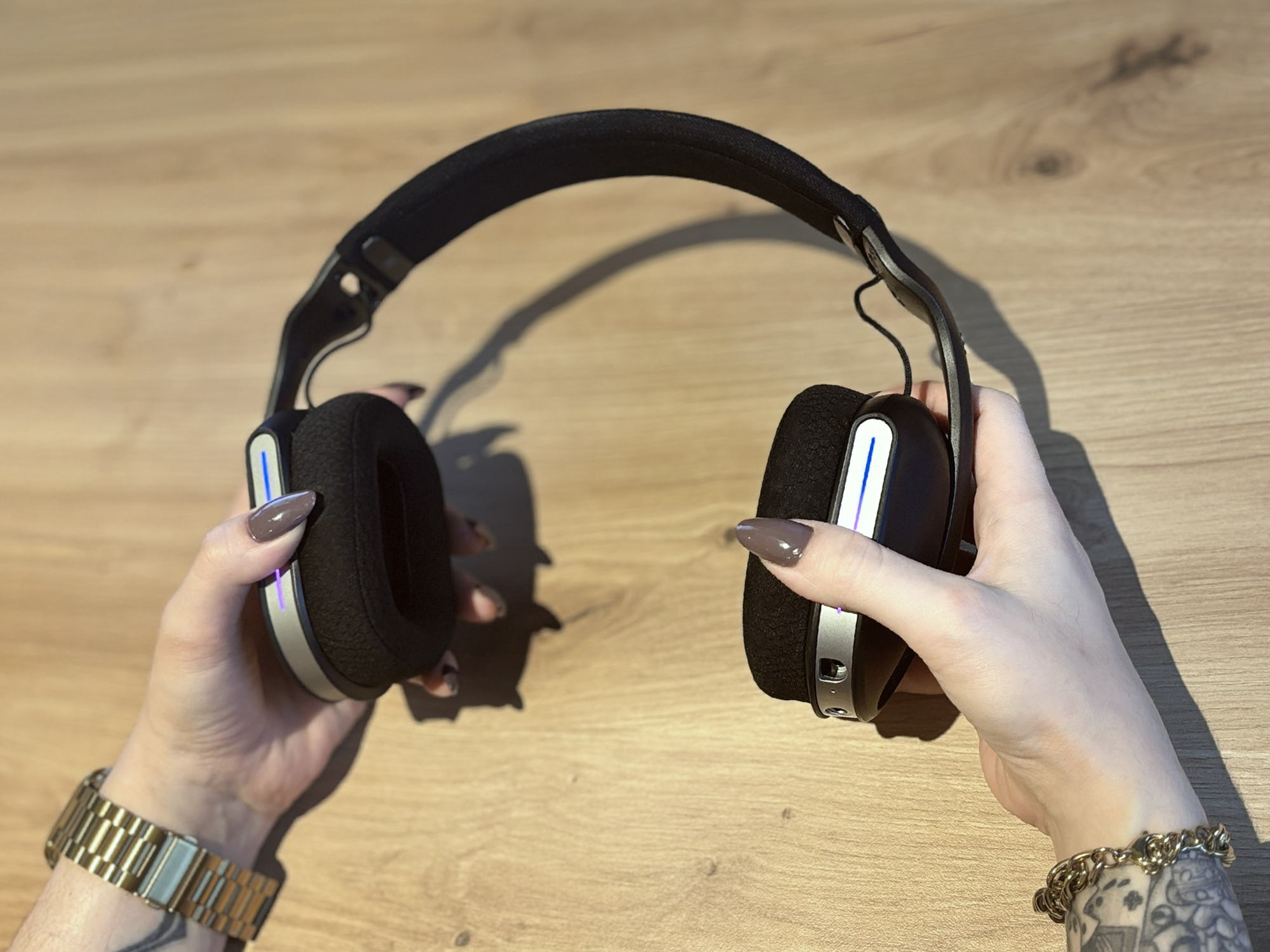 Dès la prise en main, le POLARIS surprend par sa légèreté. Avec 225g seulement, on sent tout de suite qu’on a affaire à un casque pensé pour être porté longtemps. Il se revêt d’un habillage noir (couleur Eclipse Black) avec un arceau en tissu respirant et légèrement rembourré. Deux bandes fines de LED, dégradé de violet-bleu, se posent sur l’avant. Pour ceux qui ne sont pas fans de l’ambiance RGB gamer, on peut les couper en appuyant une fois sur le bouton d’alimentation.