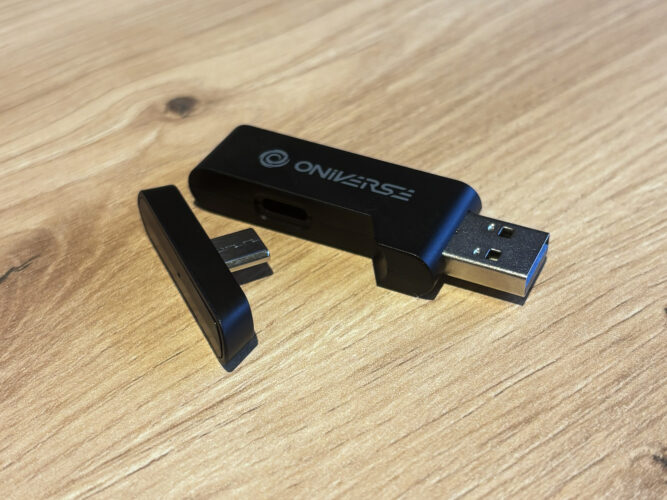 Sur la partie connectivité, Oniverse fait bien les choses. Le POLARIS propose trois modes : un dongle 2,4GHz, le Bluetooth et un câble Jack 3,5mm. Le dongle reste clairement le meilleur choix, grâce à sa très faible latence déjà évoquée plus haut. Il est fourni en USB-A et USB-C, ce qui permet de passer d’un appareil à l’autre sans se poser de question. PC, Switch 2, tablette, tout fonctionne immédiatement.