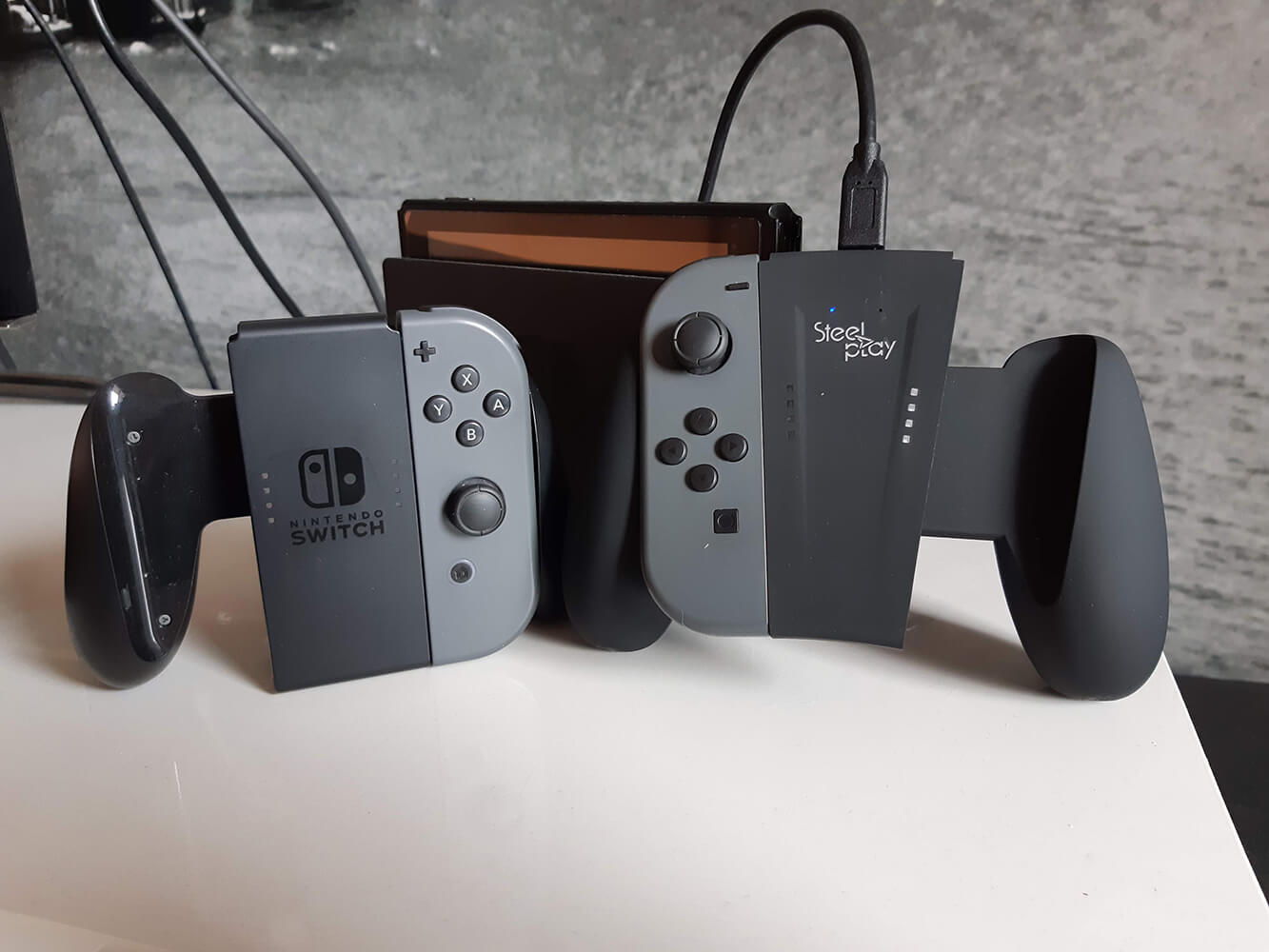 Petit bémol néanmoins. Je ne sais pas si je suis la seule personne au monde à poser mon grip, Joy-Con intégrés, à la verticale. En effet, celui d’origine permet étrangement de poser le tout non pas dos face au meuble, mais dans l’autre sens, le bas des Joy-Con vers le sol, pour faire court. Esthétiquement parlant, c’est assez joli. Malheureusement, le grip SteelPlay ne permet pas cela.