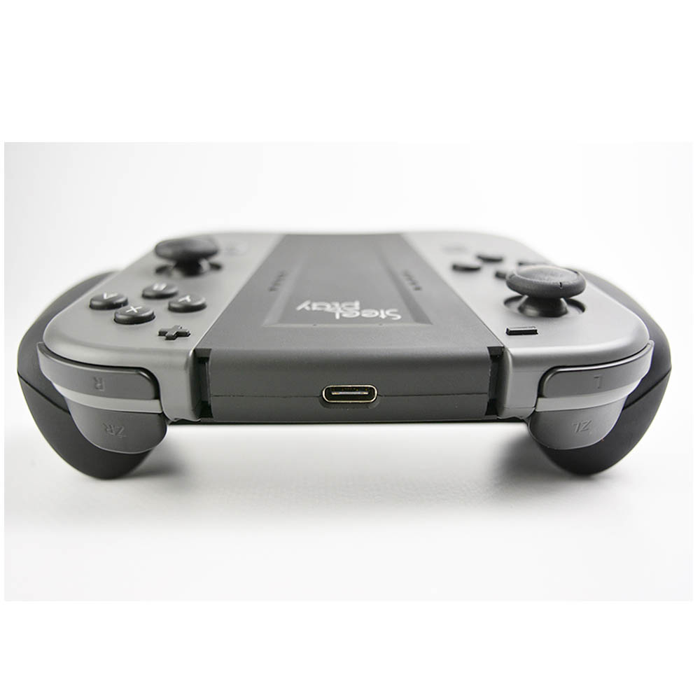 Néanmoins, le support proposé par SteelPlay a au moins le mérite de corriger cela. S’il n’est pas le plus bel accessoire que nous avons pu tester, son ergonomie a été pensée pour améliorer la prise en main des Joy-Con sur un grip. Une fois les petites manettes de la Switch insérées dans le grip, avec un tout petit peu de mal par ailleurs, le tout est très serré, vous les voyez inclinés vers l’extérieur. La prise en main propose donc, grâce à la disposition des touches via cette inclinaison, quelque chose d’un peu plus proche d’une Manette Pro. Là ne s’arrête pas la bonne ergonomie. Les » poignées » de ce grip sont plus imposantes que sur le grip d’origine. Vos mains seront mieux positionnées dessus, avec qui plus est un revêtement anti-dérapant à l’arrière. Le tout n’est pas forcément très joli, mais bien pensé.