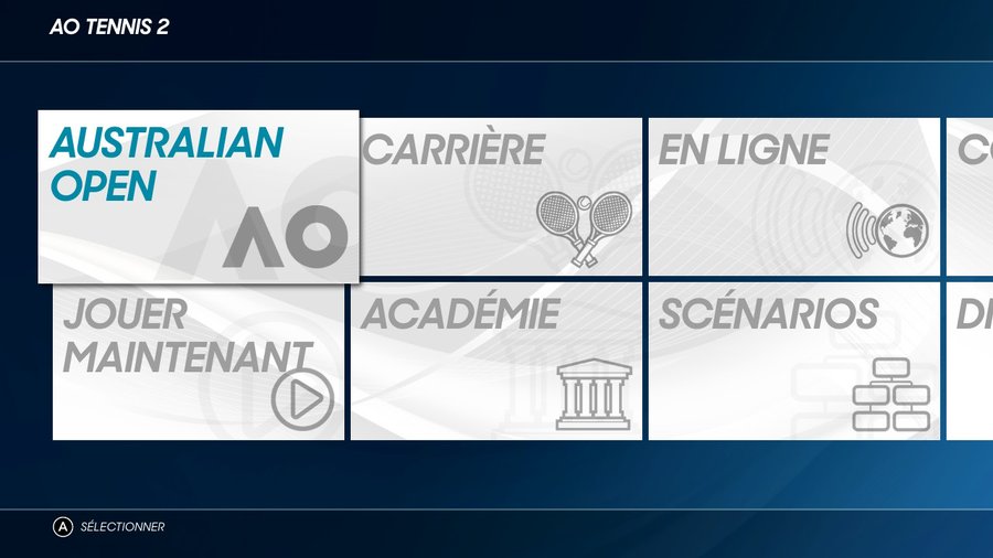 Rien de bien révolutionnaire là-dedans, puisqu’on retrouve des modes classiques tels que « Jouer maintenant » (matchs d'exhibition), le mode en ligne, la Carrière (on y reviendra plus en détail), les didacticiels, les paramètres grâce auxquels vous pouvez modifier une pléthore de choses comme le son, l’interface de l’aide au joueur, etc. S'y ajoutent quelques modes un peu plus originaux, tels que l'Australian Open vous permettant de disputer… l'Open d'Australie, l'onglet Compétition (les deux se ressemblant beaucoup), les Scénarios avec lesquels vous pouvez paramétrer des conditions de victoire ou choisir la score du début du match et enfin l'Académie où vous pouvez créer votre joueur mais aussi des stades, des logos divers et télécharger ceux des autres. On regrettera l'aspect un peu austère de l'ensemble de l'interface, même si les musiques dans les menus sont plutôt sympathiques et effacent en partie le caractère froid du jeu.