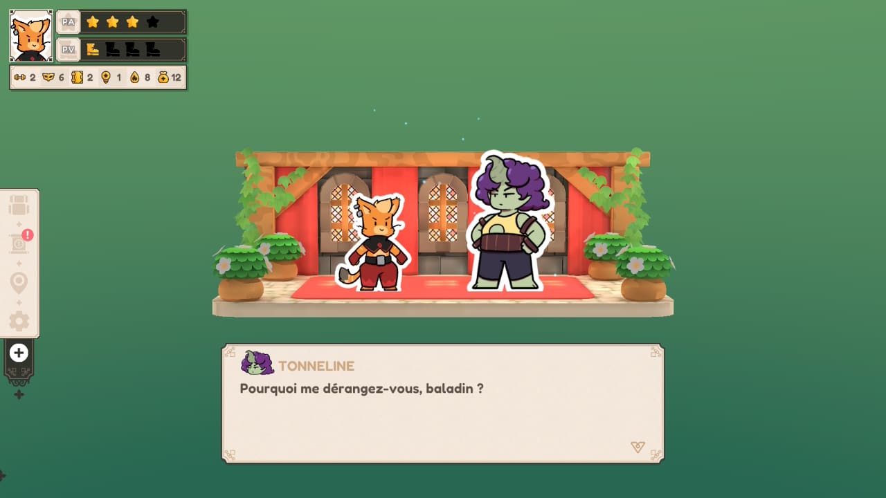 Le petit twist de Baladins réside principalement dans sa structure narrative qui conditionne en grande partie le gameplay : vos personnages sont coincés dans une boucle temporelle de six semaines à l’issue de laquelle un redoutable dragon dévore littéralement le temps pour vous renvoyer au tout début de votre partie. Seuls vos souvenirs des différentes quêtes que vous aurez activées vous resteront, un peu à la manière d’un roguelite où chaque run vous permettra de comprendre plus rapidement comment atteindre votre but, à savoir briser cette boucle temporelle.