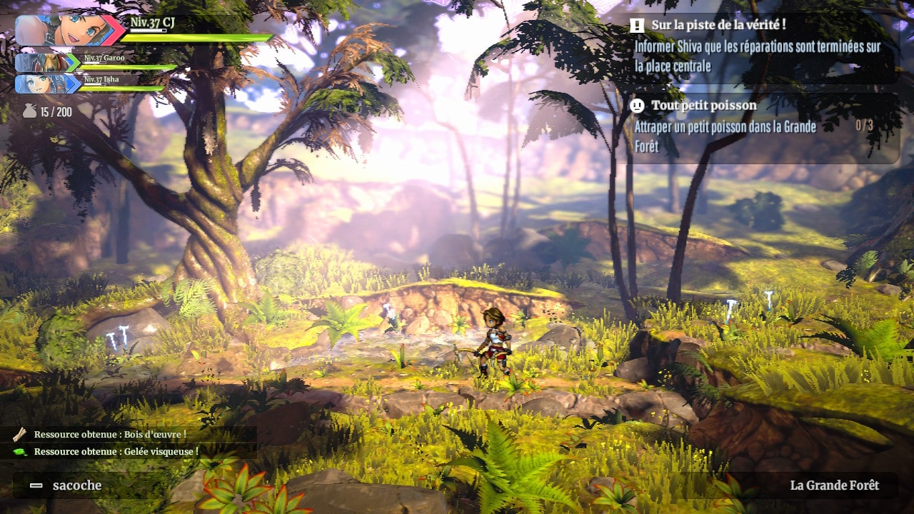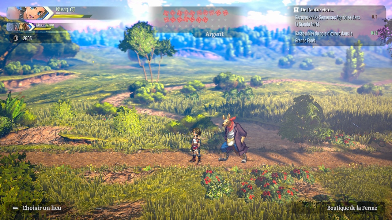 Eiyuden Chronicle: Rising se présente sous forme d’un action-RPG en 2D. Au début de l’aventure, vous incarnerez « CJ« , une chasseuse de trésors en quête d’une récompense dans le but d’accomplir un rite avant de retourner dans son village. Elle sera rapidement rejointe dans l’aventure par Garoo, un homme-kangourou, chasseur de trésors également, à la puissance nettement supérieure à celle de notre protagoniste, ainsi que par Ishaa, la maire du village capable de manier la magie. Bien que relativement simple dans leur construction et n’échappant pas aux clichés du genre, chaque personnage parvient à nous faire adhérer au monde que nous présente Eiyuden Chronicle: Rising.