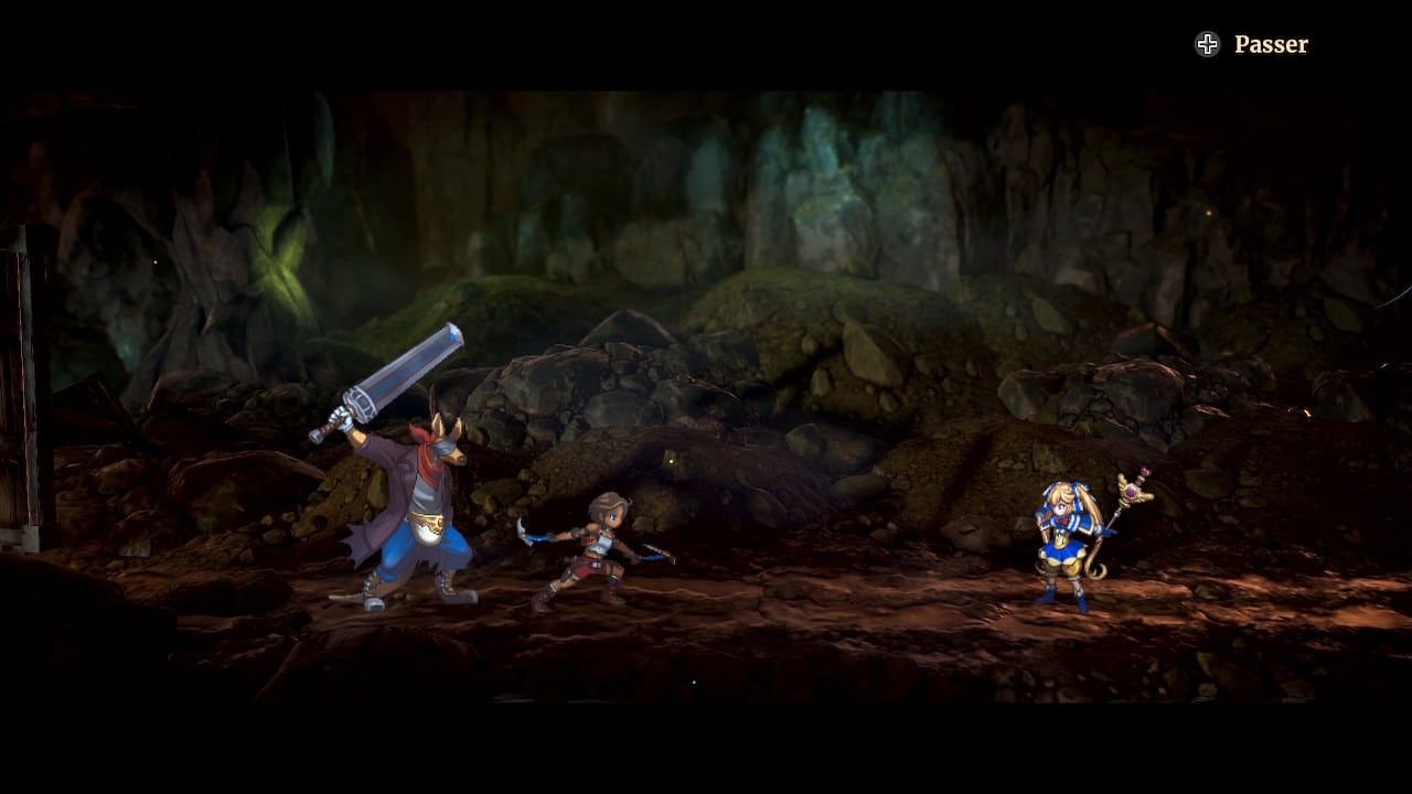 Comme dit précédemment, Eiyuden Chronicle: Rising prend la forme d’un action RPG en 2D. Lors des affrontements, l’utilisation de chacun de vos personnages sera assignée à une touche de la manette. « CJ » utilise deux lames lui permettant d’attaquer rapidement, mais avec des dégâts moindres, Garoo brandie une grande lame afin d’infliger de lourds dommages plus lentement tandis que Ishaa manie la magie à distance. L’ensemble fonctionne relativement bien et permet de rendre les affrontements dynamiques malgré une petite latence lors de la réalisation des coups s’avérant parfois rageante. Le jeu met également en place un petit système de combo qui permet d’enchaîner les coups entre les différents personnages et d’augmenter leurs dégâts lorsqu’ils sont switchés avec le bon timing, un système plutôt plaisant à réaliser.