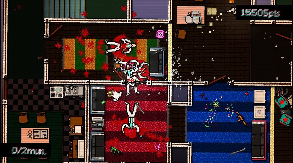Autre point primordial pour ce titre : son ambiance. Hotline Miami premier du nom vous propose en effet un voyage vers les années 80-90. Le titre offre un dépaysement grâce à un pixel art coloré rendant hommage aux images à l’époque qu’il représente. Hormis les graphismes, un autre élément se distingue très clairement, à savoir la musique. Outre une qualité remarquable dans l’ensemble des niveaux du jeu, cette dernière pourra même donner le rythme au joueur afin de l’aider dans sa quête de destruction. Il va de soi de préciser que la version Switch ne présente aucun souci technique.