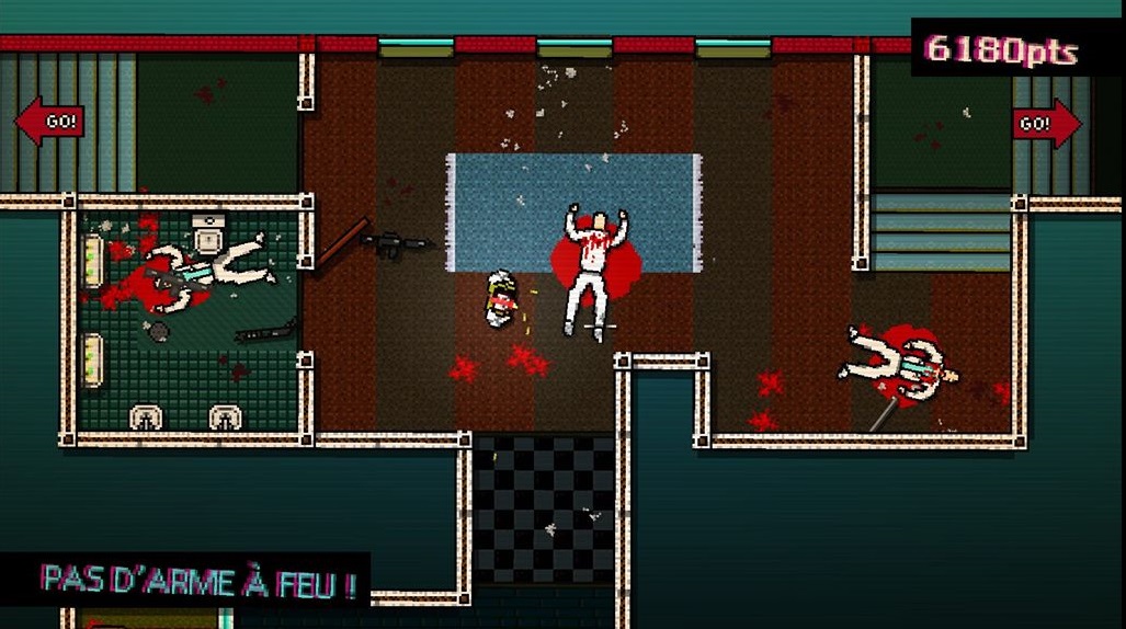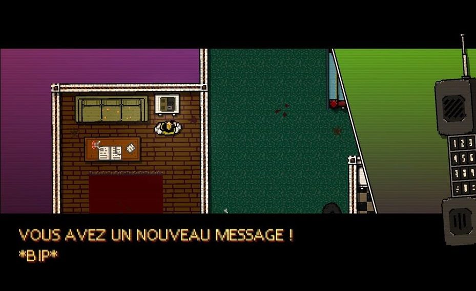 Le moins que l’on puisse dire à propos de la recette de Hotline Miami, c’est que cette dernière fonctionne très bien et très vite. Sans forcément en dévoiler trop sur les enjeux du titre, sachez que le jeu se décompose selon un enchaînement très simple. Après un bref dialogue avec un PNJ vous recevrez un coup de téléphone vous invitant à assassiner l’ensemble des ennemis d’un niveau. Malheureusement, bien qu’efficace, cette formule se répète sur l’ensemble du jeu : vous parcourrez des environnements se ressemblant pour la plupart (des salles semblables dans des bâtiments sensiblement identiques). La répétitivité se retrouve également dans les armes disponibles, le jeu vous dévoilant très vite l’ensemble de son arsenal. Bien que ce point puisse sembler préjudiciable, le titre de Devolver Digital a l’intelligence de s'arrêter avant de devenir lassant.