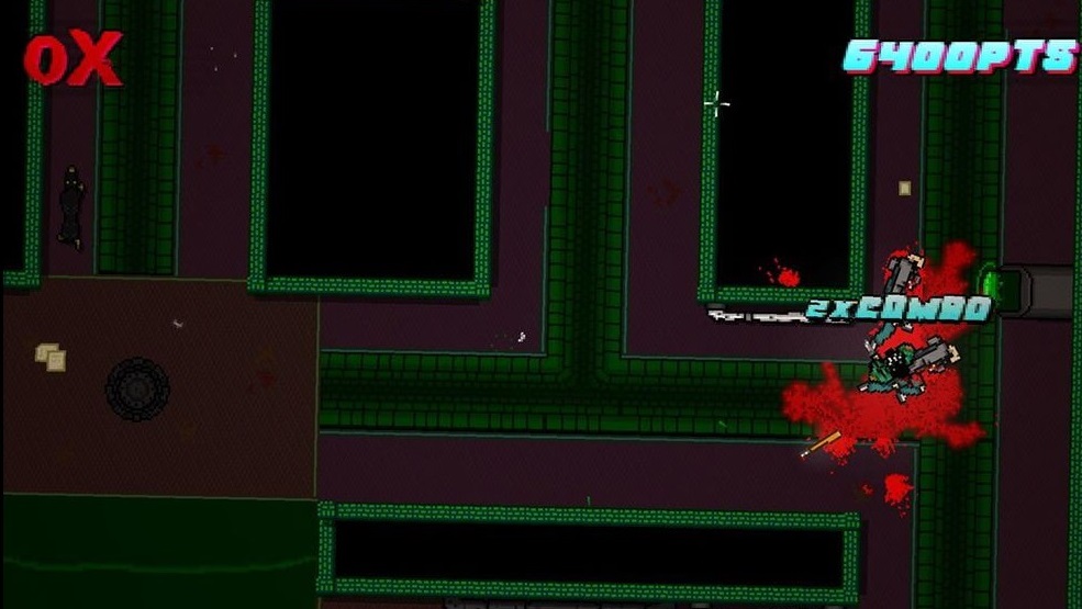 La première chose dont nous allons parler est évidemment le gameplay du jeu, qui, nous le verrons par la suite, est l’argument principal du soft. Le jeu se présente sous la forme d’un jeu de tir en deux dimensions et en vue du dessus. Très vite, vous comprendrez que le moindre impact de balle vous sera fatal. De votre coté vous devrez vous débarrasser de vos ennemis ; pour cela votre première arme sera vos poings. Si ces derniers ne seront pas létaux, un dernier assaut sur votre ennemi vous permettra d’en venir à bout. Une fois ces ennemis tués, il vous sera possible de récupérer les armes que ces derniers avaient en leur possession. Le tir avec ces armes est l’une des premières complications de cette version Switch ; en effet, la visée avec les armes à feu peut s’avérer par moment quelque peu fastidieuse avec une manette. Cependant, après un cours moment d’adaptation, ce détail s’avère tout à fait mineur.