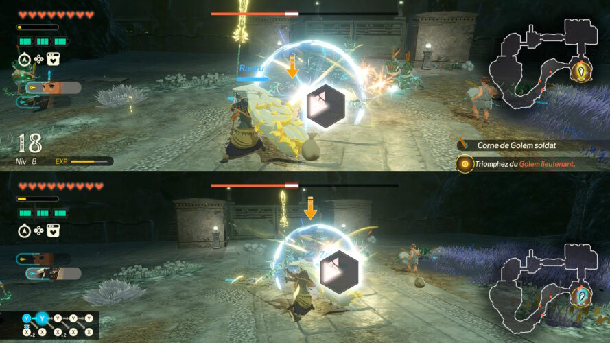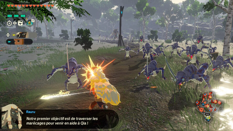 Qui dit jeu tiré de l’univers de Tears of the Kingdom dit gameplay provenant de ce dernier. Et si sur le papier le mélange ne semble pas des plus évidents, les équipes de Koei Tecmo semblent avoir réussi à implémenter de nombreuses mécaniques du jeu le plus ambitieux de Nintendo dans leur Warriors. Cela passe notamment par les équipements Soneau, qui, en échange de la consommation de batterie, seront capables d’asperger les troupes ennemies de glace, feu ou encore électricité… Notons également que l’utilisation du moteur de Nintendo permet de combiner ces éléments entre eux afin de créer des interactions telles qu’envoyer du vent sur des flammes dans le but de créer des petites tornades enflammées ou encore électrifier un groupe d’ennemis se trouvant tous les pieds dans l’eau.