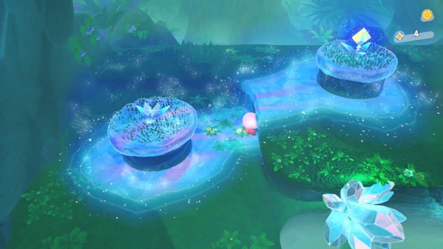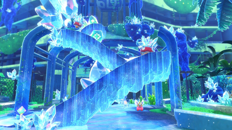 L’une des craintes légitimes à propos de cette Nintendo Switch 2 Edition étaient d’avoir le sentiment de refaire plus ou moins le même jeu qu’en 2022, puisque les nouveautés prennent place dans des niveaux déjà existants. En vérité, lorsque Kirby active des petits cristaux de lumière sur la carte, de nouvelles plateformes apparaissent, dévoilant un tout nouveau tracé dans l’environnement. Ces passages exclusifs à ces niveaux « Pays des Étoiles Filantes » parviennent à être suffisamment différents des niveaux originaux pour ne pas ressentir une certaine redite de l’expérience originale. En vérité, Kirby parcourt des environnements et des passages originaux la majeure partie du temps, et se raccroche à des points déjà existants à quelques moments du niveau avant de découvrir un nouveau chemin original très rapidement.