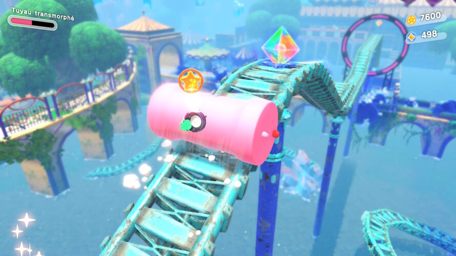 Au-delà du passage en 3D, la grande proposition de Kirby et le Monde Oublié concernait les transformations en objet du quotidien, permettant de faire face à des situations inédites. Le Pays des Étoiles Filantes n’oublie pas cet aspect en offrant de nouvelles transformations importantes à Kirby, avec notamment le ressort, offrant la possibilité à votre personnage de réaliser des sauts bien plus importants, ou encore le rouage dont la capacité de s’accrocher au mur propose des situations tout à fait inédites et une verticalité plus importante au titre qui est tout sauf désagréable. De ce côté, le Pays des Étoiles Filantes arrive parfaitement à se renouveler et disposer de nouvelles façons de déplacer Kirby dans les environnements.