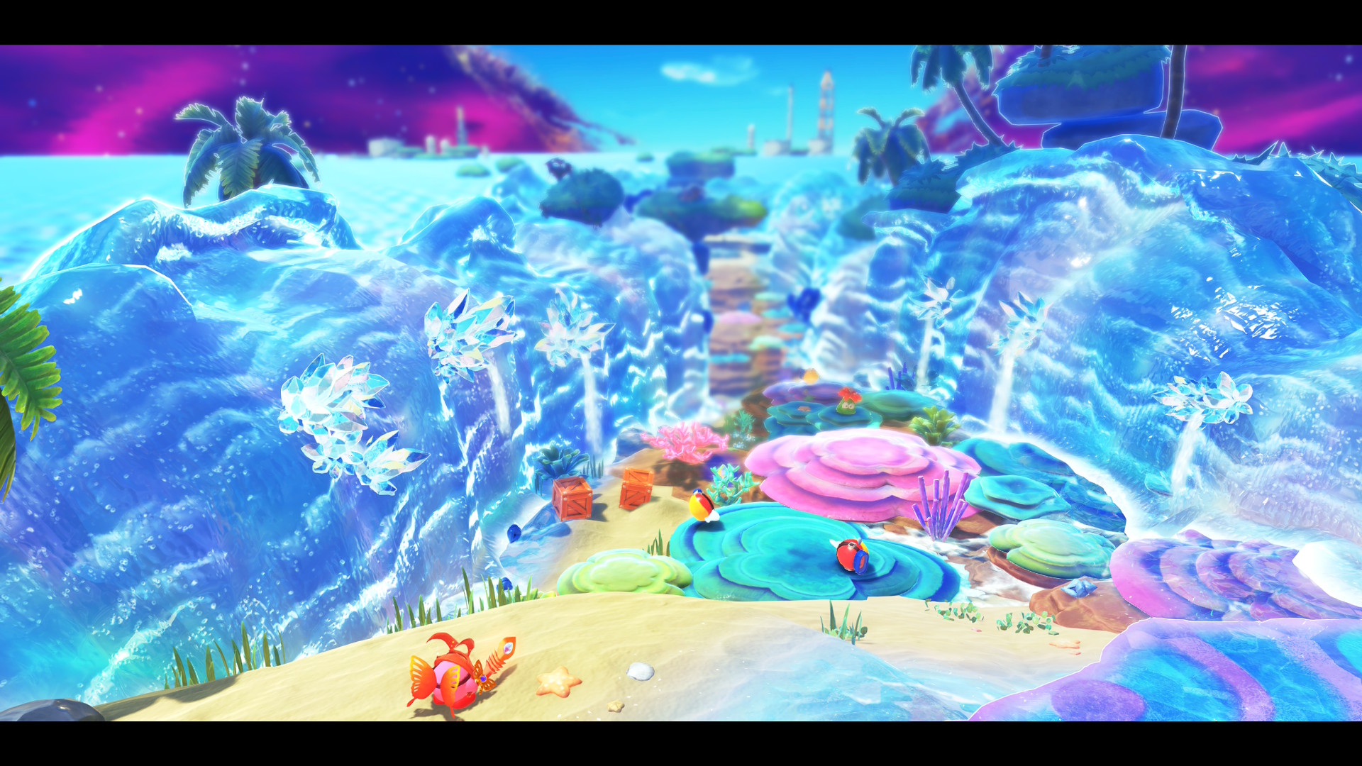 L’une des craintes légitimes à propos de cette Nintendo Switch 2 Edition étaient d’avoir le sentiment de refaire plus ou moins le même jeu qu’en 2022, puisque les nouveautés prennent place dans des niveaux déjà existants. En vérité, lorsque Kirby active des petits cristaux de lumière sur la carte, de nouvelles plateformes apparaissent, dévoilant un tout nouveau tracé dans l’environnement. Ces passages exclusifs à ces niveaux « Pays des Étoiles Filantes » parviennent à être suffisamment différents des niveaux originaux pour ne pas ressentir une certaine redite de l’expérience originale. En vérité, Kirby parcourt des environnements et des passages originaux la majeure partie du temps, et se raccroche à des points déjà existants à quelques moments du niveau avant de découvrir un nouveau chemin original très rapidement.