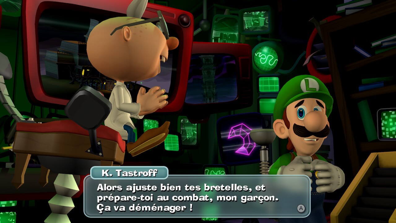 Pour celles et ceux qui sont totalement néophytes, commençons par un petit rappel du principe de cette saga. Vous incarnez Luigi, et devez parcourir un manoir à la recherche de fantômes. Le but étant de les aspirer, un peu (totalement même) à la façon de Ghost Busters, à l’aide d’un aspira…d’un Ectoblast, pardon. Cet appareil, au-delà de vous conférer le pouvoir de dépoussiérer totalement la pièce, chasse les fantômes et constitue votre arme principale tout au long du jeu. Ce principe fondamental est le même dans chaque épisode de Luigi’s Mansion, avec évidemment des subtilités de gameplay qui se construisent tout autour. Dans Luigi’s Mansion 2 HD, le professeur Karl Tastroff vous appelle afin d’étudier un phénomène plutôt étrange (hormis le fait que le jeu grouille de fantômes, cela va sans dire) : les spectres sont totalement hors de contrôle et se mettent à semer la panique dans le monde, tandis que jusqu’à lors K. Tastroff (vous l’avez, ça y est ?) contrôlait parfaitement la situation. C’est là que vous entrez en scène, et quelle entrée.